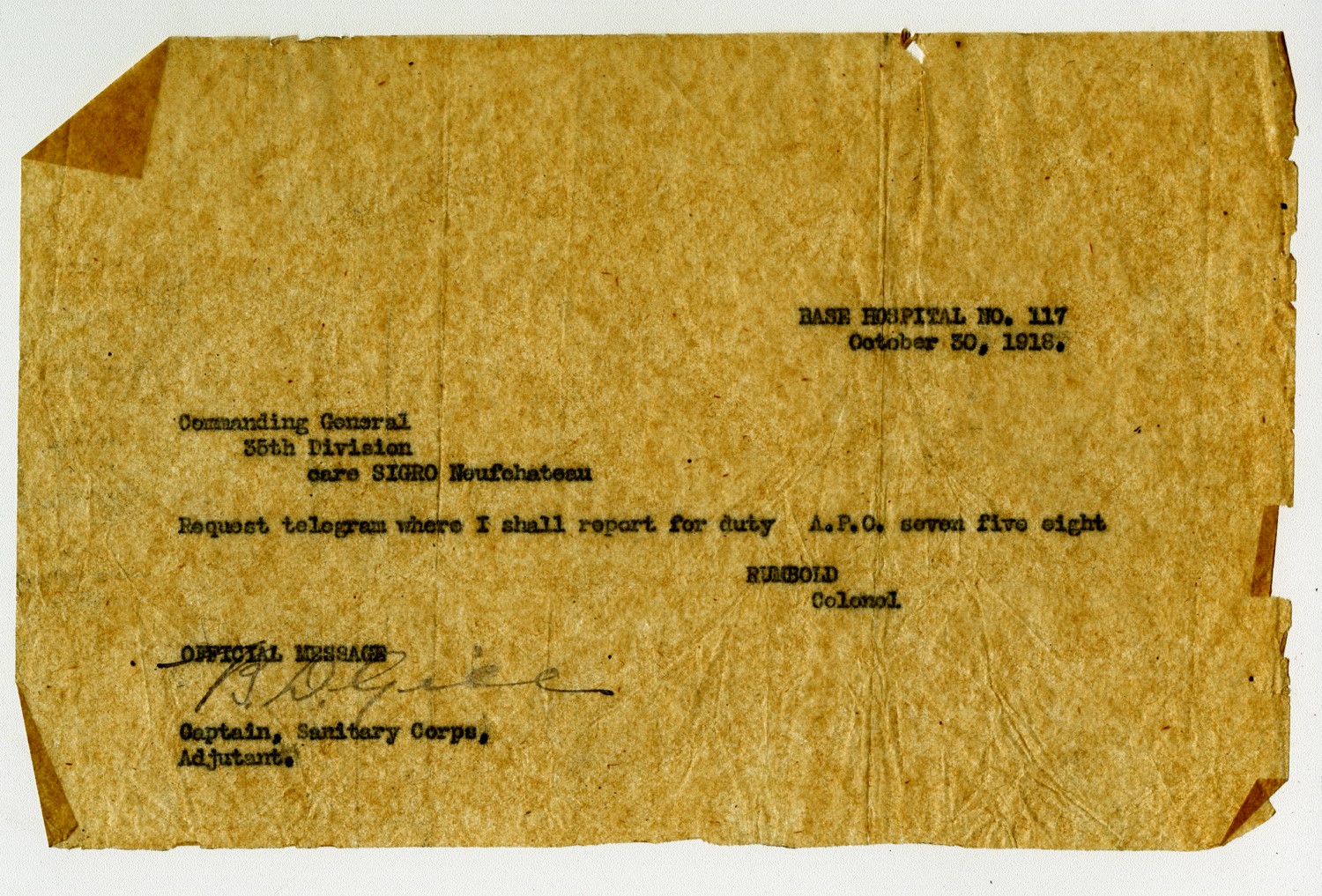 BASE HOSPITAL NO. 117 October 30, 1918. Commanding General 35th Division care SIGRO Neufchateau Request telegram where I shall report for duty A.P.O. seven five eight. RUMBOLD Colonel OFFICIAL MESSAGE B.D. Gill Captain, Sanitary Corps, Adjutant.