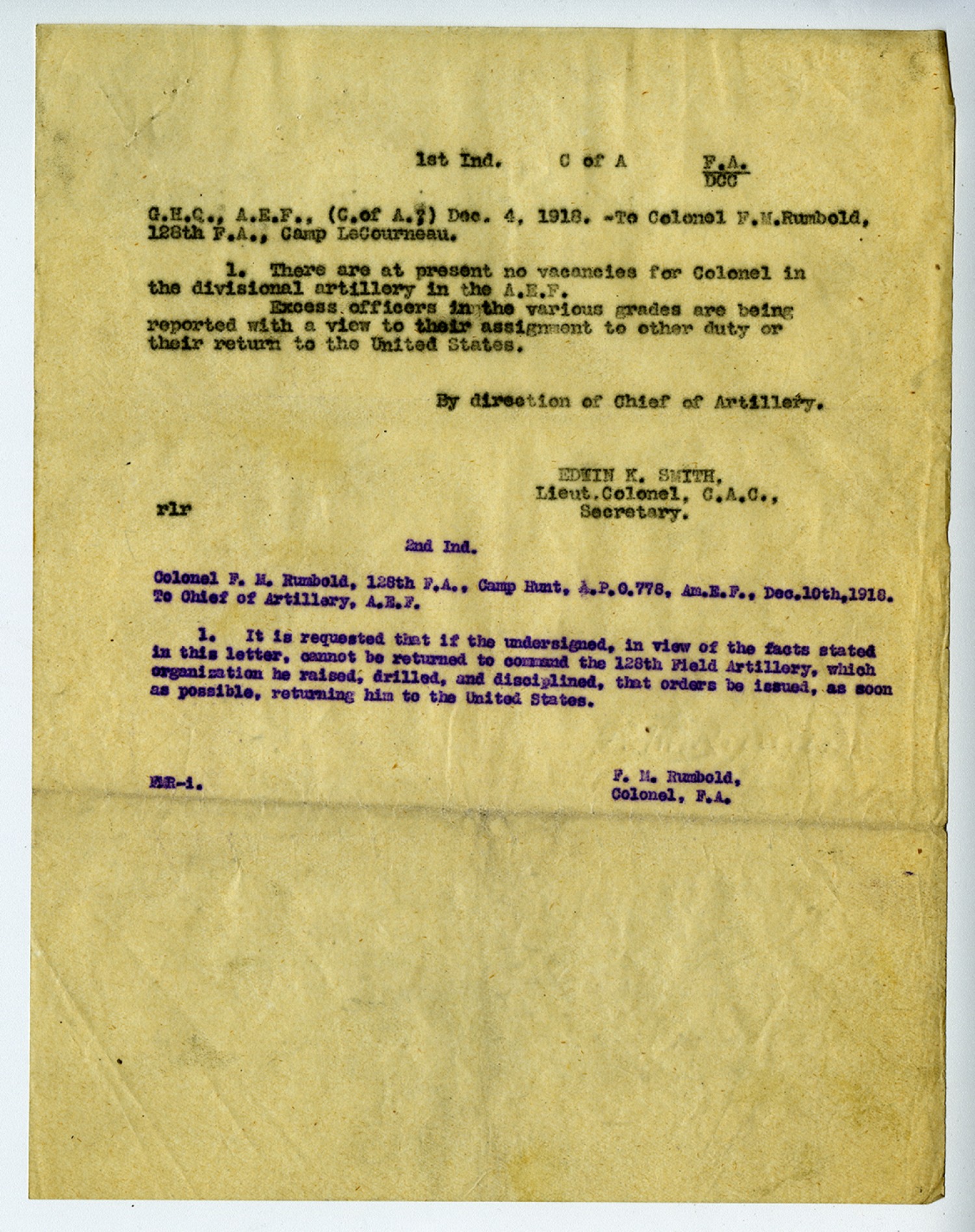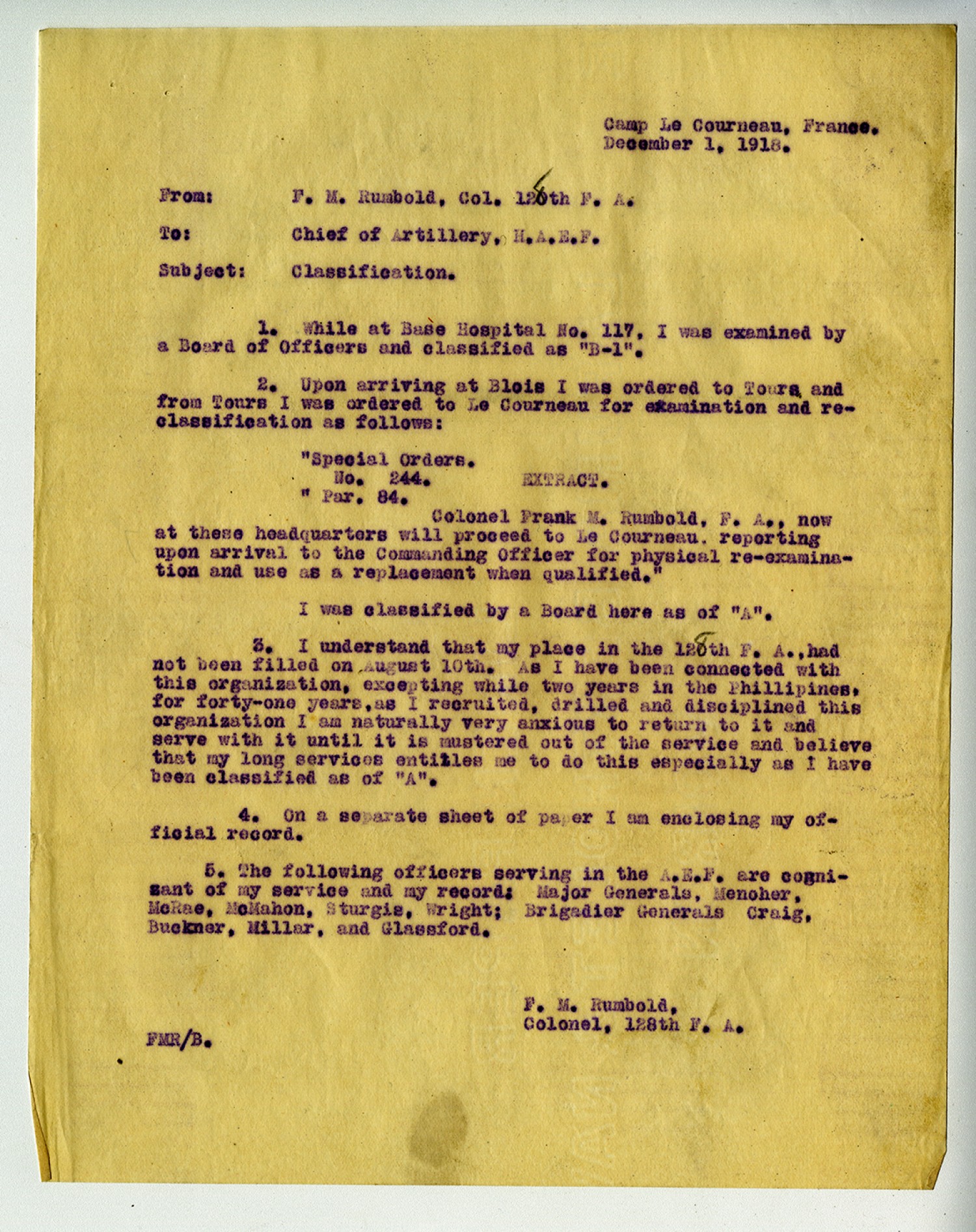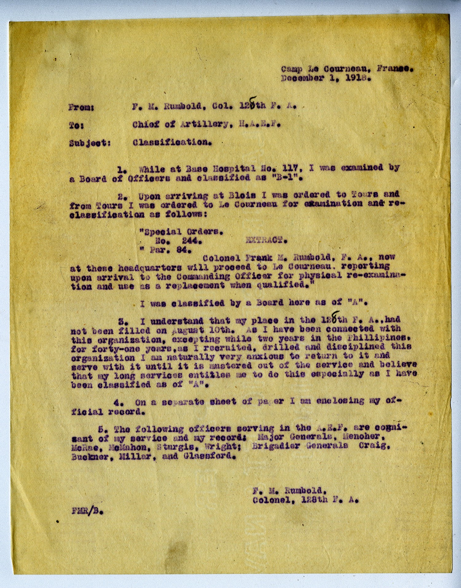 Camp Le Courneau, France. December 1, 1918. From: F.M. Rumbold, Col. 128th F.A. To: Chief of Artillery, H.A.E.F. Subject: Classification. 1. While at Base Hospital No. 117, I was examined by a Board of Officers and classified as