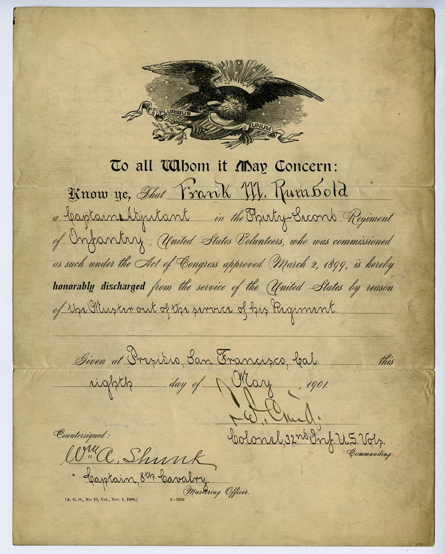 [PLURIBUS UNUM letterhead] To all Whom it May Concern: Know ye, That Frank M. Rumbold a Captain & Adjutant in the Thirty-Second Regiment of Infantry, United States Volunteers, who was commissioned as such under the Act of Congress approved March 2, 1899, is hereby honorably discharged from the service of the United States by reason of the Muster out of the service of his Regiment. Given at Presidio San Francisco, [California] this eighth day of May, 1901. L.A. Craig Colonel, 32nd Inf. U.S. Vols. Commanding. Countersigned: Wu