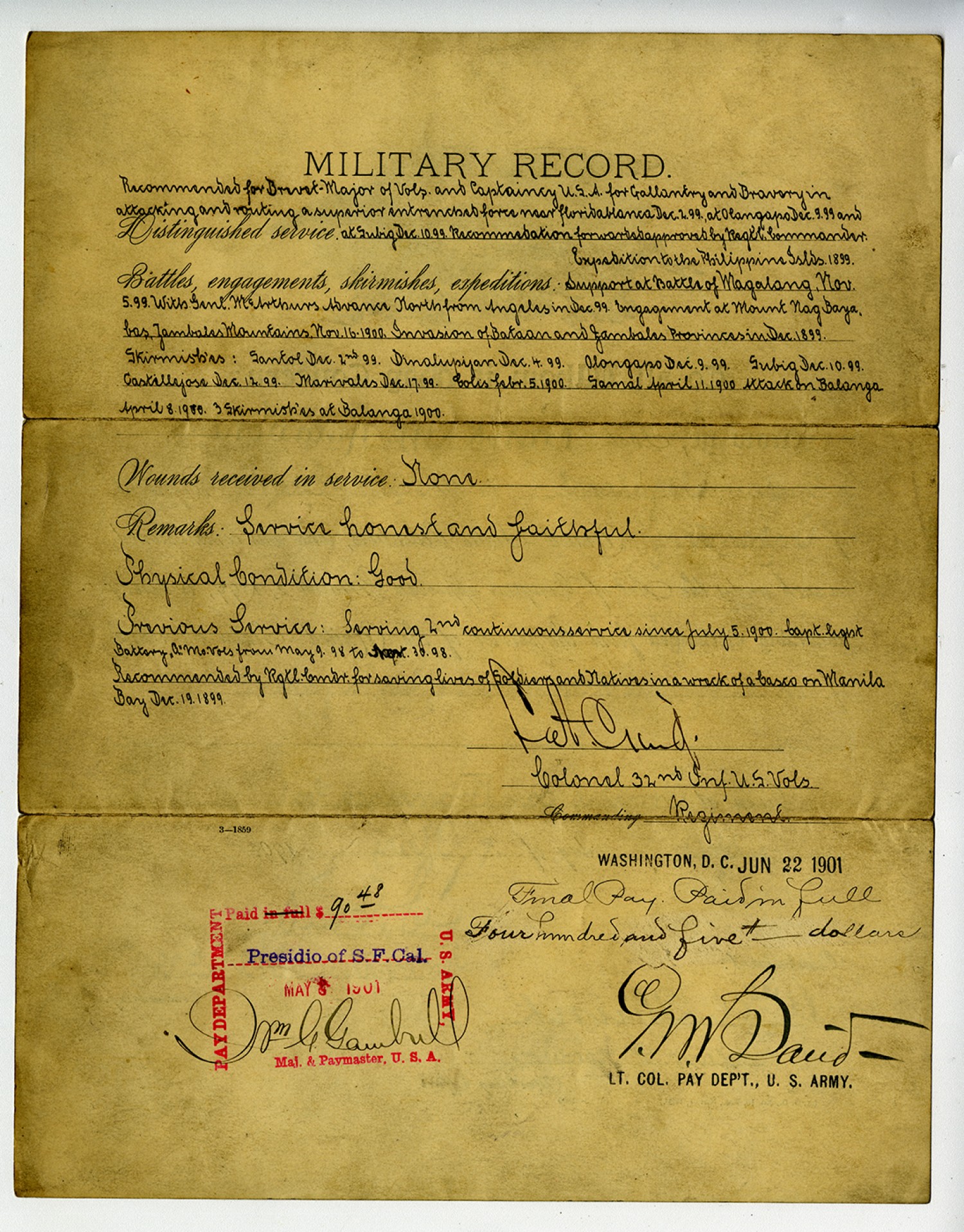 MILITARY RECORD. Recommended for Brevet-Major of Vols. and Captaincy U.S.A. for Gallantry and Bravery in attacking and routing a superior entrenched force near Floridablanca [December] 2. [1899], at Olangapo [December] 9 [1899] and Distinguished service at Subig [December] 10. [1899]. Recommendation forwarded approved by Regtl. Commander. Expedition to the Philippines Islds. 1899. Battles, engagements, skirmishes, expeditions Support at Battle of Magalang, [November] 5. [1899]. With Genl. McAurthurs Advance North from Angeles in [December 1899]. Engagement at Mount Nag Baya. bas, Zambales Mountains. [November] 16-1900. Invasion of Bataan and Zambales Provinces in [December] 1899. Skirmishes: Santol [December] 2nd [1899]. Dinalupijan [December] 4. [1899]. Olongapo [December] 9. [1899]. Subig [December] 10. [1899]. Castillejose [December] 12 [1899]. Mariveles [December] 17. [1899]. Colis [February] 5. 1900. Samal April 11. 1900 Attack on Balanga April 8. 1900. 3 Skirmishes at Balanga 1900. Wounds received in service: None. Remarks: Service honest and faithful. Physical Condition: Good. Previous Service: Serving 2nd continuous service since July 5. 1900. Capt. light Battery