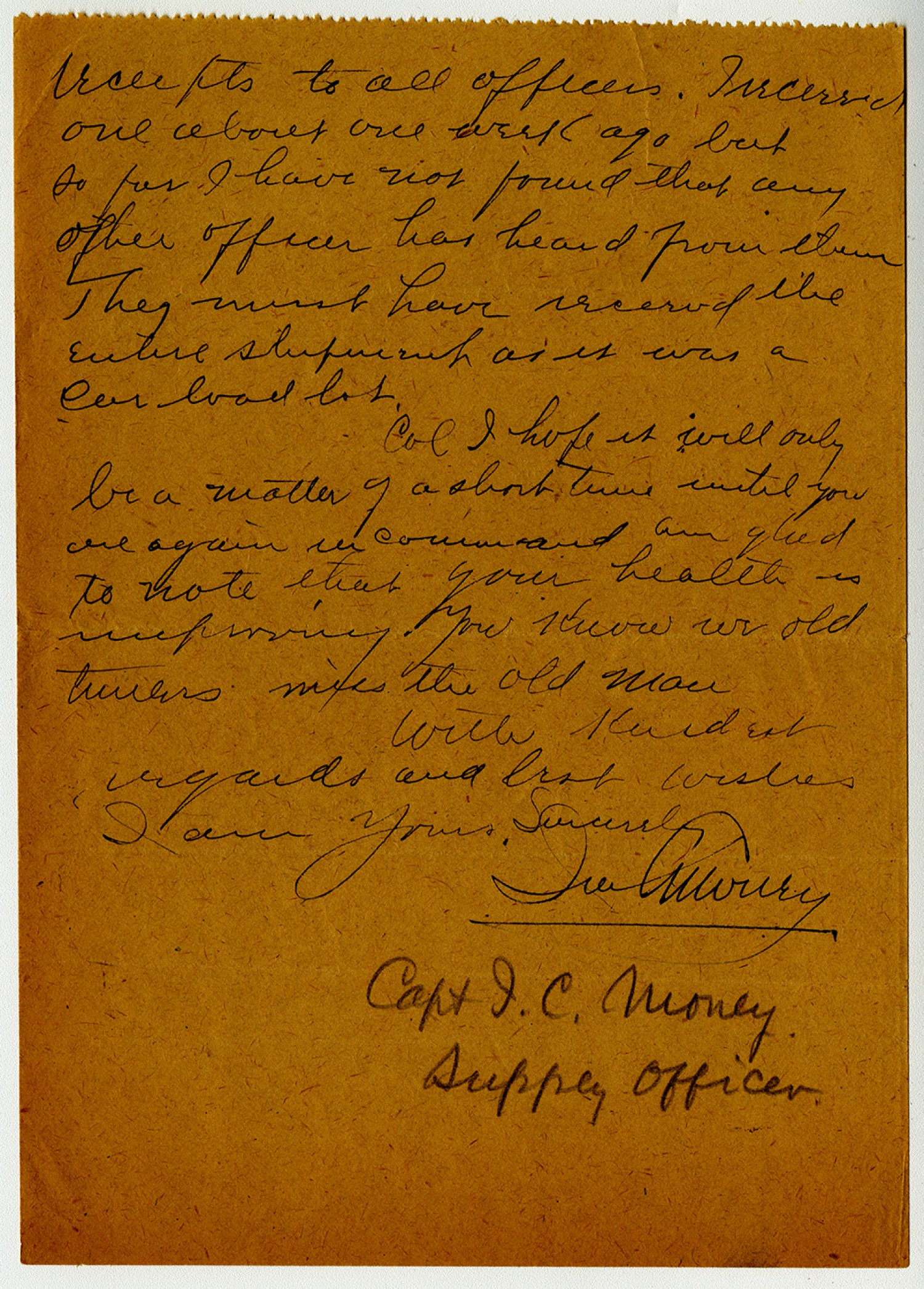 receipts to all officers. I received one about one week ago but so far I have not found that any other officer has heard from them They must have received the entire shipment as it was a car load lot. Col I hope it will only be a matter of a short time until you are again in command am glad to note that your health is improving. You know our old timers miss the old man With kindest regards and best wishes I am Yours Sincerely Ira Money Capt. I.C. Money Supply Officer