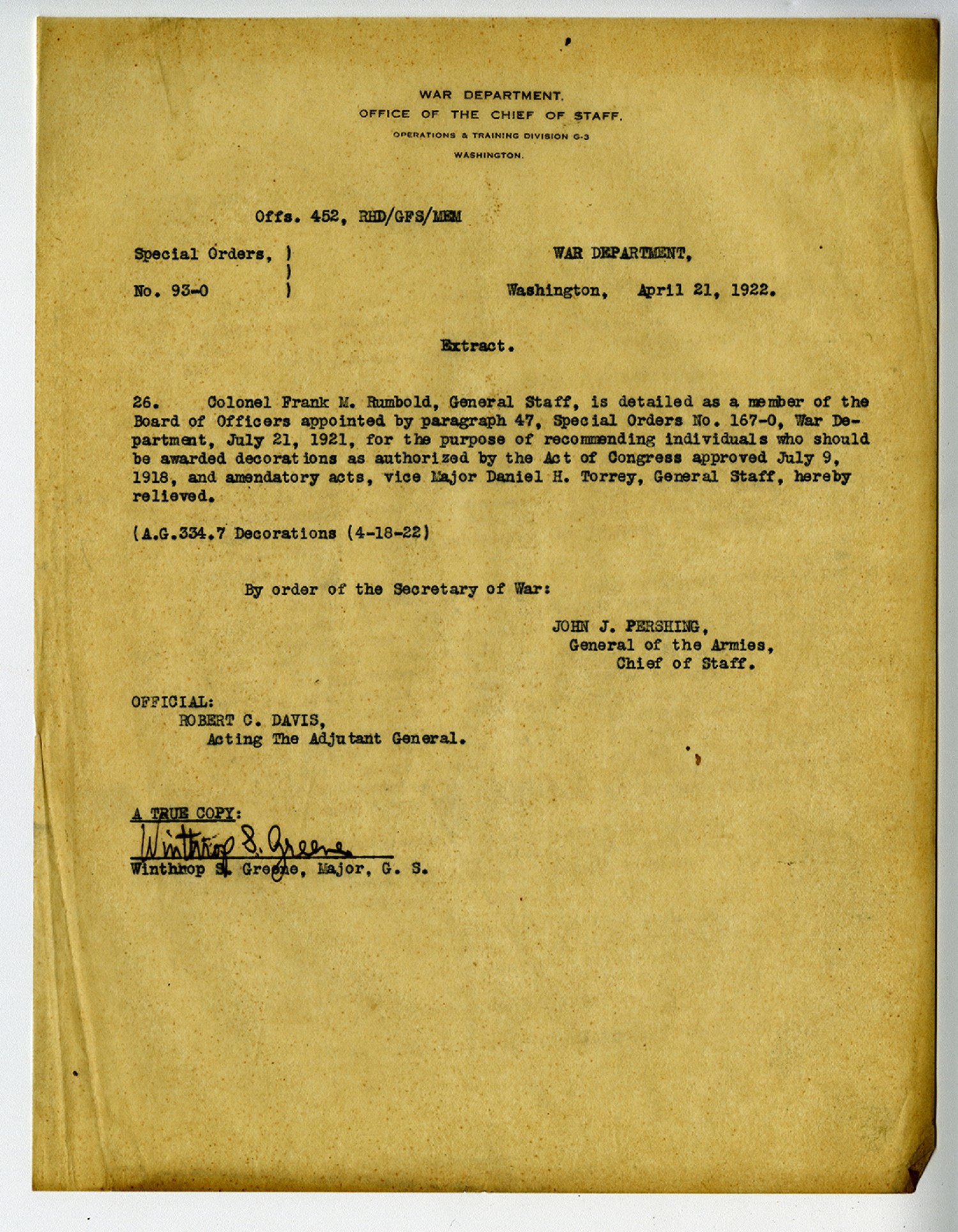 [War Department letterhead] Offs. 452, RHD/GFS/MEM Special Orders,) No. 93-0 WAR DEPARTMENT, Washington, April 21, 1922. Extract. 26. Colonel Frank M. Rumbold, General Staff, is detailed as a member of the Board of Officers appointed by paragraph 47, Special Orders No. 167-0, War Department, July 21, 1921, for the purpose of recommending individuals who should be awarded decorations as authorized by the Act of Congress approved July 9, 1918, and amendatory acts, vice Major Daniel H. Torrey, General Staff, hereby relieved. (A.G. 334.7 Decorations (4-18-[1922]) By order of the Secretary of War: JOHN J. PERSHING, General of the Armies, Chief of Staff. OFFICIAL: ROBERT C. DAVIS, Acting The Adjutant General. A TRUE COPY: Winthrop S. Greene, Major G.S.