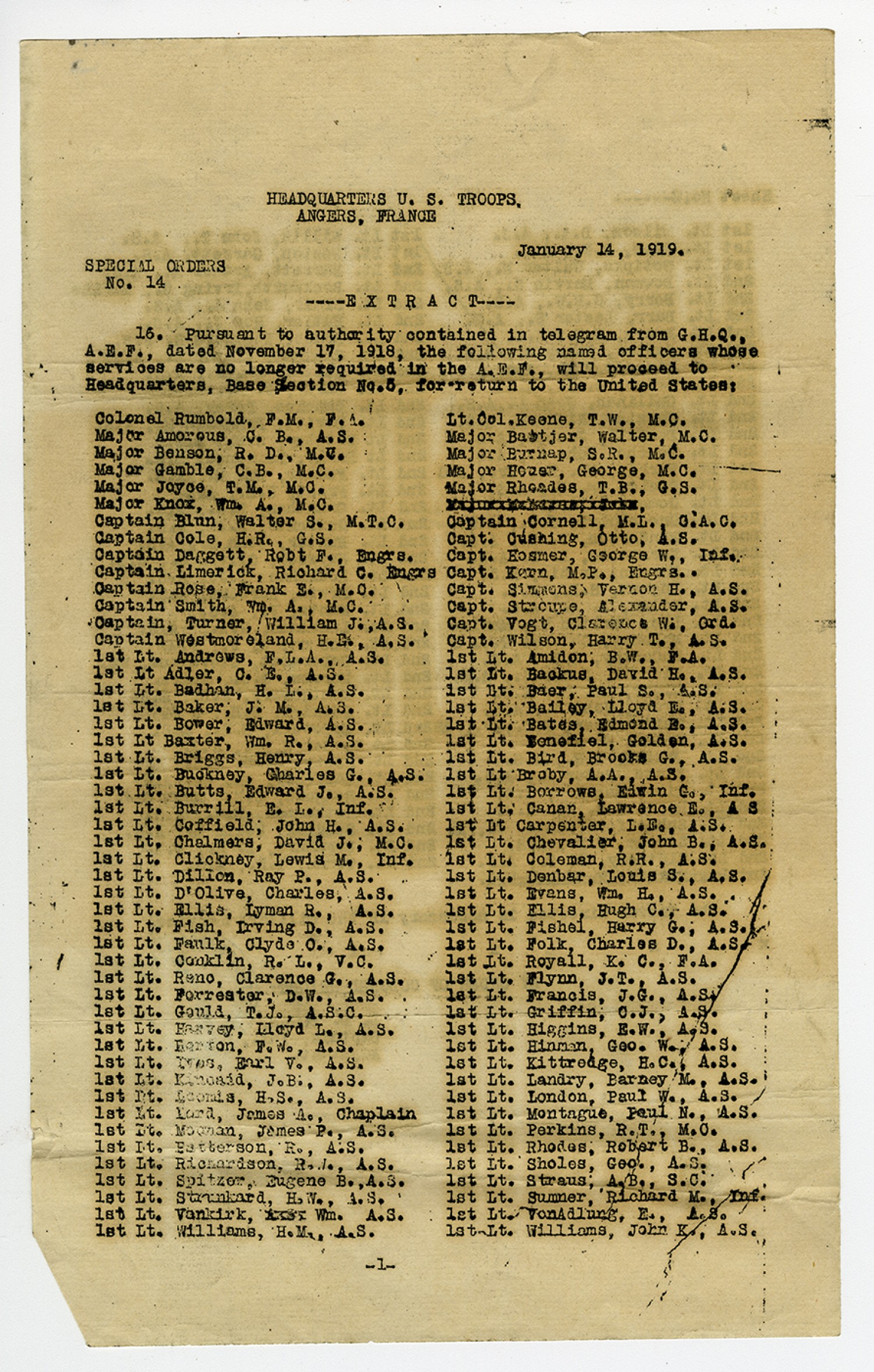HEADQUARTERS U.S. TROOPS, ANGERS, FRANCE January 14, 1919. SPECIAL ORDERS No. 14 EXTRACT 16. Pursuant to authority contained in telegram from G.H.Q., A.E.F., dated November 17, 1918, the following named officers whose services are no longer required in the A.E.F., will proceed to the Headquarters, Base Section No. 5, for return to the United States. Colonel Rumbold, F.M., F.A. Major Amorous, C.B., A.S. Major Benson, R.D., M.U. Major Gamble, C.B., M.C. Major Joyce, T.M., M.C. Major Know, Wm. A., M.C. Captain Blun, Walter S., M.T.C. Captain Cole, H.R., G.S. Captain Daggett, Robt F., Engrs. Captain Limerick, Richard C. Engrs Captin Rose, Frank E., M.C. Captain Smith, Wm. A., M.C. Captain, Turner, William J., A.S. Captain Westmoreland, H.E., A.S. 1st Lt. Andrews, F.L.A., A.S. 1st Lt Adler, C.E., A.S. 1st Lt. Badhan, H.L., A.S. 1st Lt. Baker, J.M., A.S. 1st Lt. Bower, Edward, A.S. 1st Lt. Baxter, Wm. R., A.S. 1st Lt. Briggs, Henry, A.S. 1st Lt. Buckney, Charles G., A.S. 1st Lt. Butts, Edward J., A.S. 1st Lt. Burrill, E.L., Inf. 1st Lt. Coffield, John H., A.S. 1st Lt. Chalmers, David J., M.C. 1st Lt. Clickney, Lewis M., Inf. 1st Lt. Dillon, Ray P., A.S. 1st Lt. D