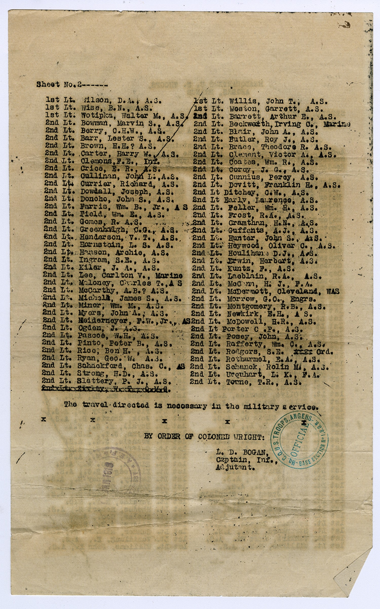 Sheet No. 2------ 1st Lt. Wilson, D.A., A.S. 1st Lt. Wise, B.N., A.S. 1st Lt. Wotipka, Walter M., A.S. 2nd Lt. Bowman, Marvin S., A.S. 2nd Lt. Berry, C.H.W., A.S. 2nd Lt. Barr, Lester S., A.S. 2nd Lt. Brown, H.H.? A.S. 2nd Lt. Carter, Harry W., A.S. 2nd Lt. Clemons, F.E., Inf. 2nd Lt. Crice, E.R., A.S. 2nd Lt. Cullinan, John L., A.S. 2nd Lt. Currier, Richard, A.S. 2nd Lt. Dowdall, Joseph, A.S. 2nd Lt. Donoho, John S., A.S. 2nd Lt. Farris, Wm. B., Jr., AS 2nd Lt. Field, Wm. E., A.S. 2nd Lt. Gomes, R. A.S. 2nd Lt. Greenhalgh, C.G., A.S. 2nd Lt. Henderson, V.T., A.S. 2nd Lt. Hornstoin, L.S. A.S. 2nd Lt. Hanson, Archie, A.S. 2nd Lt. Ingram, S.E., A.S. 2nd Lt. Kiler, J.A., A.S. 2nd Lt. Lee, Carlton V., Marine 2nd Lt. Maloney, Charles T., A S 2nd Lt. McCarthy, A.B.? A.S. 2nd Lt. Michell, James S., A.S. 2nd Lt. Minor, Wm. M., A.S. 2nd Lt. Myers, John A., A.S. 2nd Lt. Neiderneyer, F.W., Jr., AS 2nd Lt. Ogden, J. A.S. 2nd Lt. Pascoe, W.H., A.S. 2nd Lt. Pinto, Peter B., A.S. 2nd Lt. Rice, Ben H., A.S. 2nd Lt. Ryan, Geo. W. A.S. 2nd Lt. Schackford, Chas. C., AS 2nd Lt. Strong, H.D., A.S. 2nd Lt. Slattery, P.J., A.S. 1st Lt. Willis, John T., A.S. 1st Lt. Weston, Garrett, A.S. 2nd Lt. Barrett, Arthur E., A.S. 2nd Lt. Beckwerth, Irving C., Marine 2nd Lt. Blair, John A., A.S. 2nd Lt. Butler, Roy J., A.S. 2nd Lt. Brace, Theodore R. A.S. 2nd Lt. Clement, Victor A., A.S. 2nd Lt. Coates, Wm., R., A.S. 2nd Lt. Coroy, J.G., A.S. 2nd Lt. Cunnius, Percy, A.S. 2nd Lt. Dovitt, Franklin H., A.S. 2nd Lt. Ditchey, C.W., A.S. 2nd Lt. Early, Lawrence, A.S. 2nd Lt. Feller, Wm. H., A.S. 2nd Lt. Frost, R.A., A.S. 2nd Lt. Cramthan, H.N., A.S. 2nd Lt. Lt. Guffants, A.J., A.S. 2nd Lt. Hunter, John S., A.S. 2nd Lt. Heywood, Oliver C., A.S. 2nd Lt. Houlihan D.J., A.S. 2nd Lt. Erwin, Herbert, A.S. 2nd Lt. Kuntz, F., A.S. 2nd Lt. Laeblain, R.A., A.S. 2nd Lt. McCann, H.J., F.A. 2nd Lt. McDermott, Cleveland, WAS 2nd Lt. Morrow, G.O., Engrs. 2nd Lt. Montgomery, R.B., A.S. 2nd Lt. Newkirk, E.H., A.S. 2nd Lt. McDowell, H.R., A.S. 2nd Lt. Porter C.P., A.S. 2nd Lt. Posey, John, A.S. 2nd Lt. Rafferty, Wm. C., A.S. 2nd Lt. Rodgers, S.E. Ord. 2nd Lt. Rotharmel, E.A., A.S. 2nd Lt. Schanck, Rolin M., A.S. 2nd Lt. Urquhart, L.K., F.A. 2nd Lt. Towne, T.R., A.S. The travel directed is necessary in the military service. BY ORDER OF COLONEL WRIGHT: L.D. BOGAN, Captain, Inf. Adjutant.