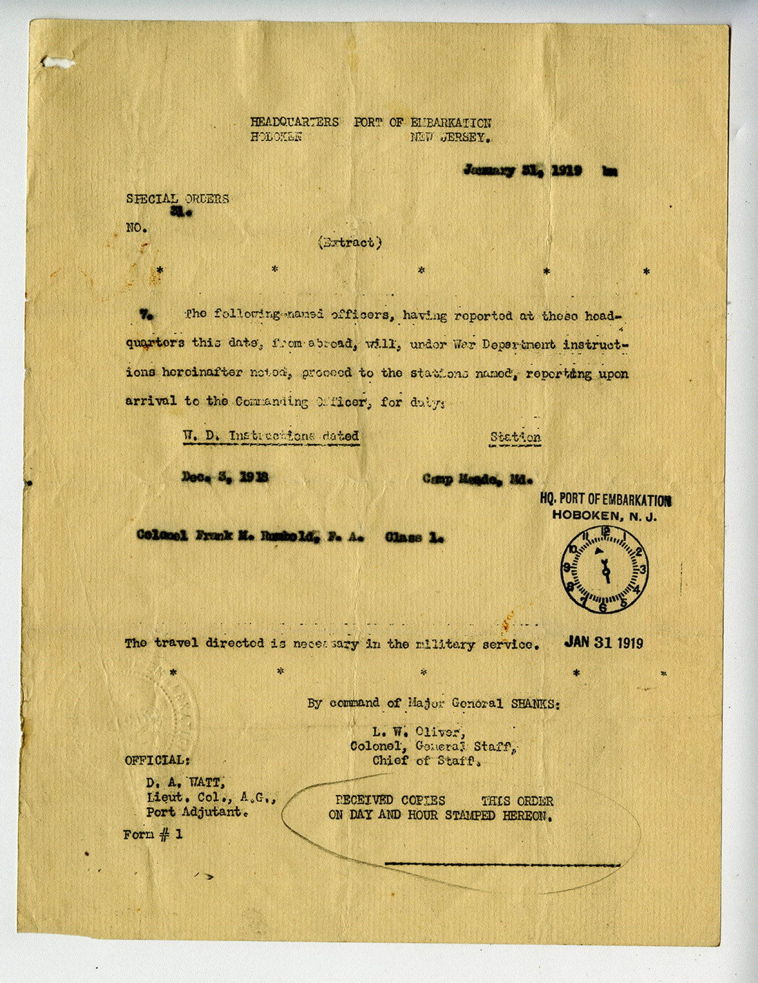 HEADQUARTERS PORT OF EMBARKATION HOBOEN NEW JERSEY. January 31, 1919 SPECIAL ORDERS NO. 31 (Extract) The following named officers, having reported at these headquarters this date, from abroad, will, under War Department instructions hereinafter noted, proceed to the stations named, reporting upon arrival to the Commanding Officer, for duty: W.D. Instructions dated [December] 3, 1918 Station Camp Meade, [Maryland] Colonel Frank M. Rumbold, F.A. Class 1. The travel directed is necessary in the military service. By command of Major General SHANKS: L.W. Oliver, Colonel, General Staff, Chief of Staff. OFFICIAL: D.A. WATT, Lieut. Col., A.G., Port Adjutant. Form #1 RECEIVED COPIES THIS ORDER ON DAY AND HOUR STAMPED HEREON.