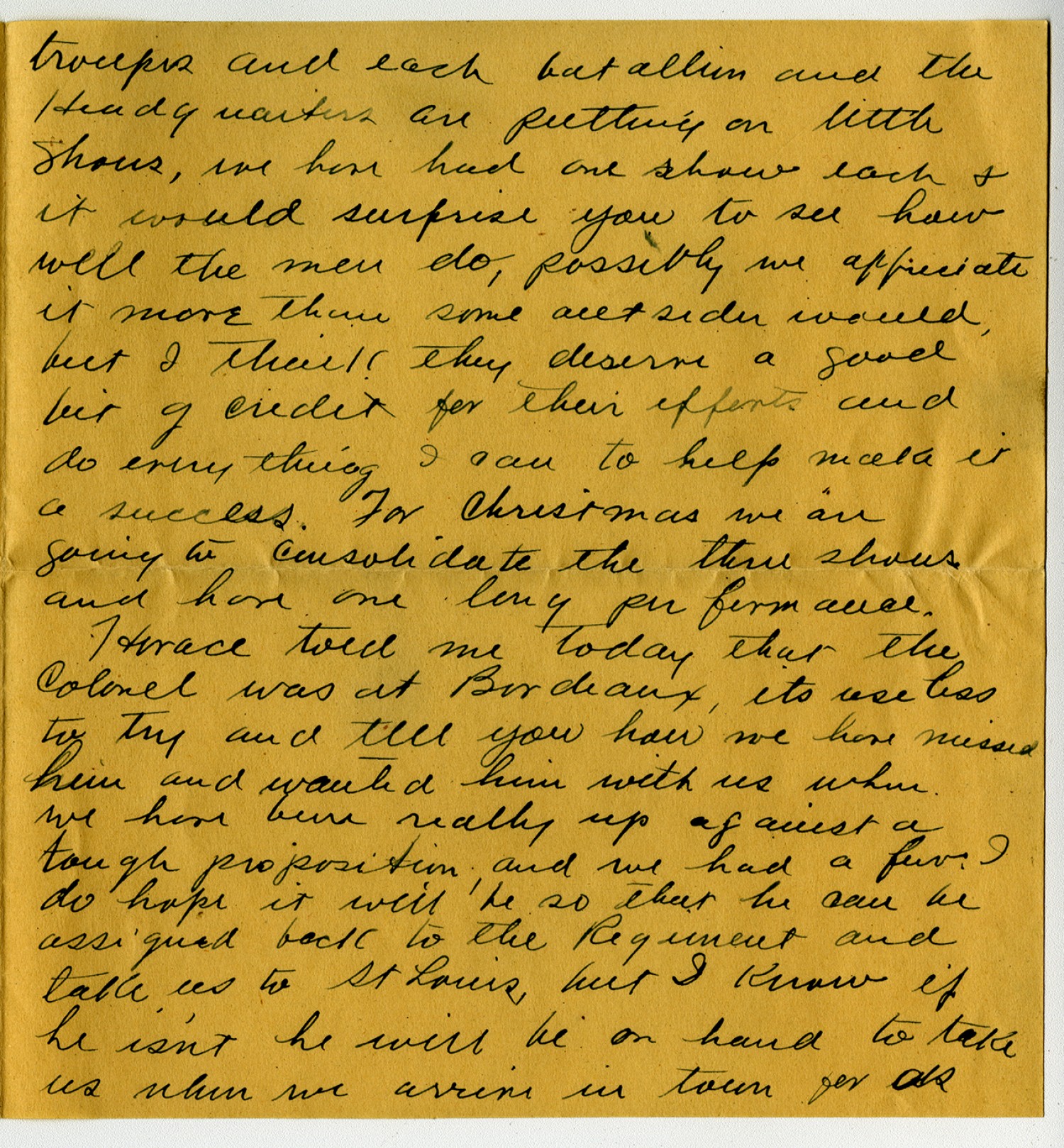 troops and each batallion and the Headquarters are putting on little shows, we have had one show each & it would surprise you to see how well the men do, possibly we appreciate it more than some outsider would, but I think they deserve a good bit of credit for their efforts and do everything I can to help make it a success. For Christmas we are going to consolidate the three shows and have one long performance. Horace told me today that the Colonel was at Bordeaux, its useless to try and tell you how we have missed him and wanted him with us when we have been really up against a tough proposition and we had a few. I do hope it will be so that he can be assigned back to the Regiment and take us to St Louis, but I know if he isn