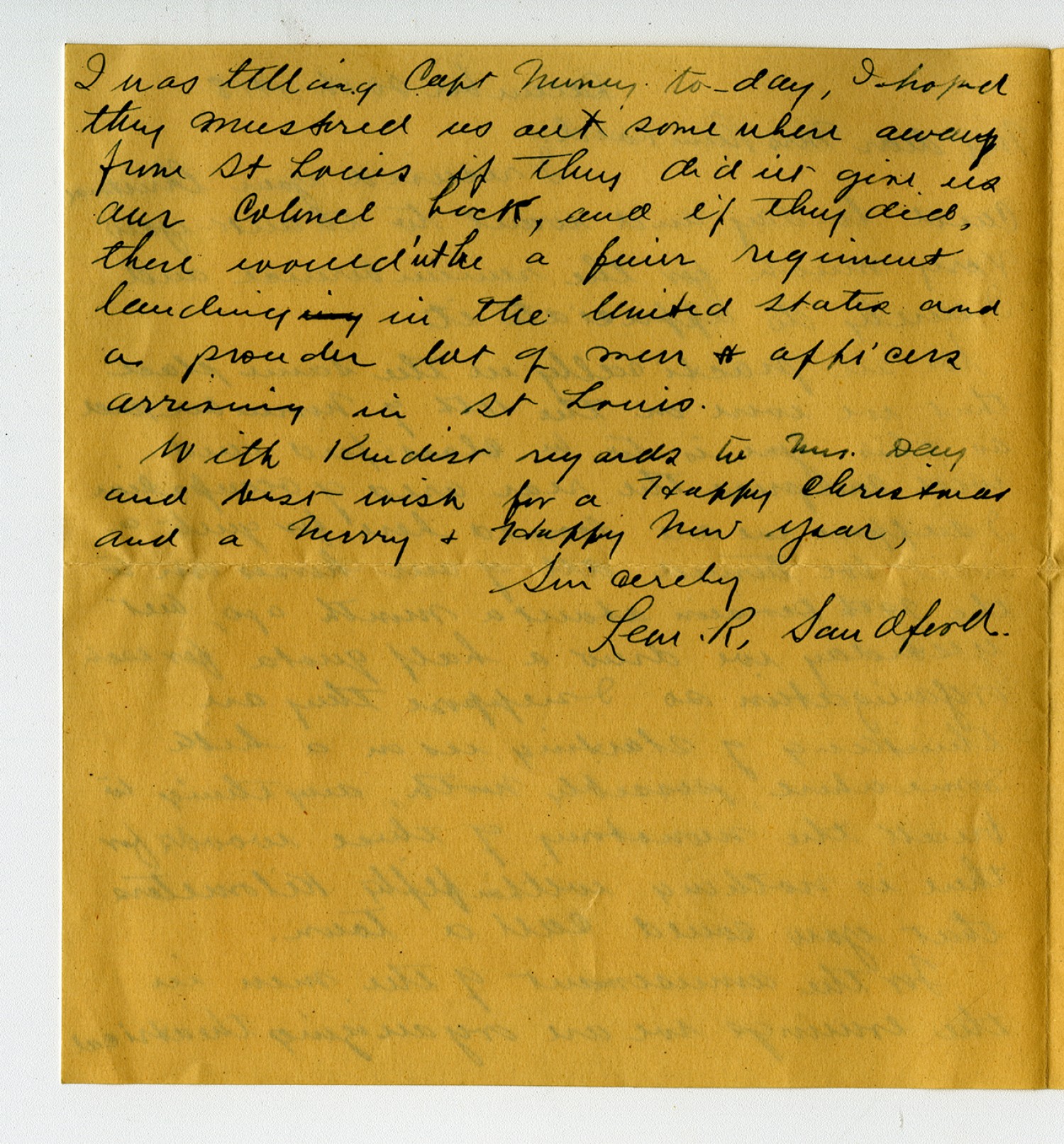 I was telling Capt Rumsey to-day, I hoped they mustered us out some where away from St Louis if they didnt give us our Colonel back, and if They did, there wouldn