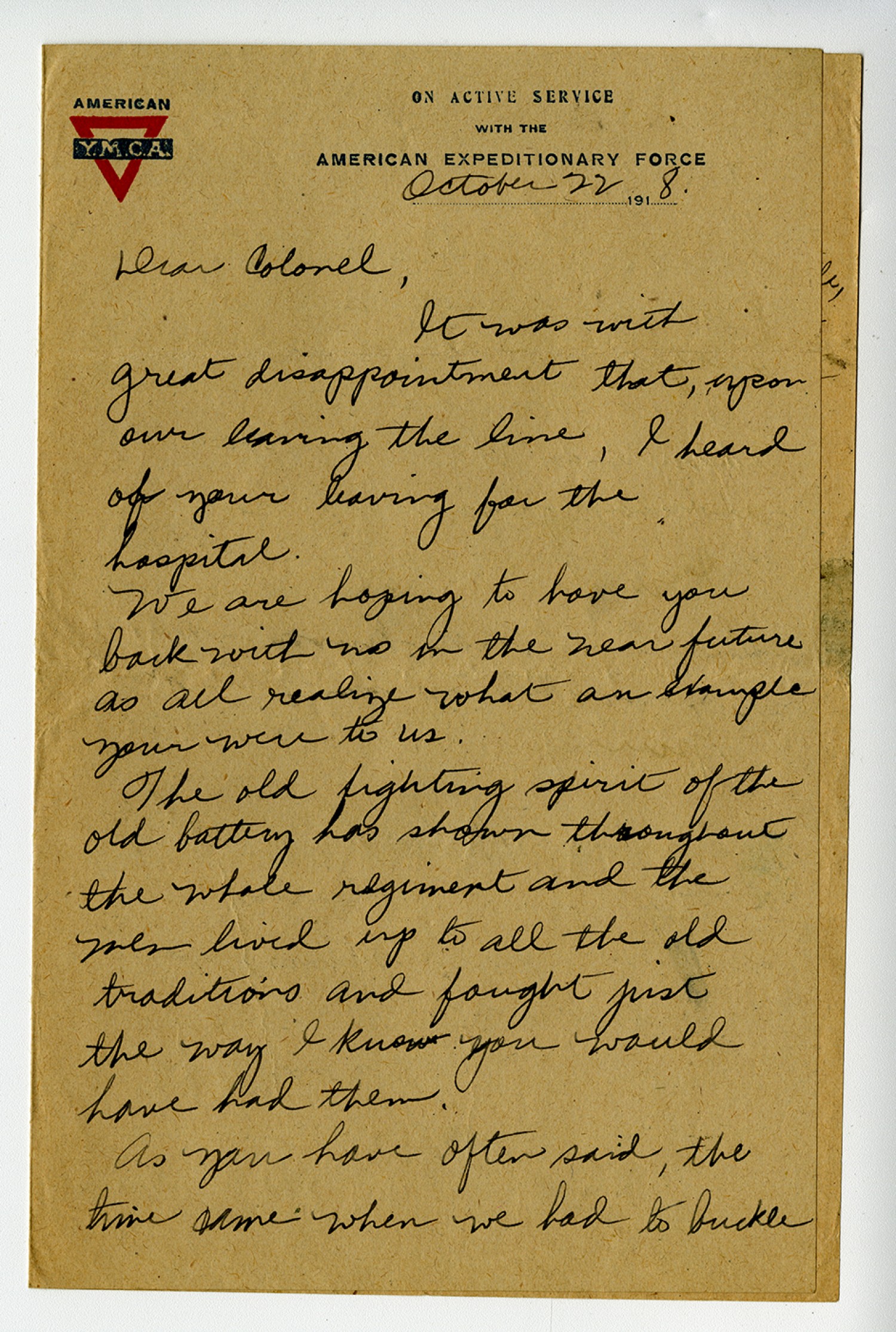 [Y.M.C.A. letterhead] October 22 1918 Dear Colonel, It was with great disappointment that, upon our leaving the line, I heard of your leaving for the hospital. We are hoping to have you back with us in the near future as all realize what an example your were to us. The old fighting spirit of the old battery has shown throughout the whole regiment and the men lived up to all the old traditions and fought just the way I know you would have had them. As you have often said, the time came when we had to buckle