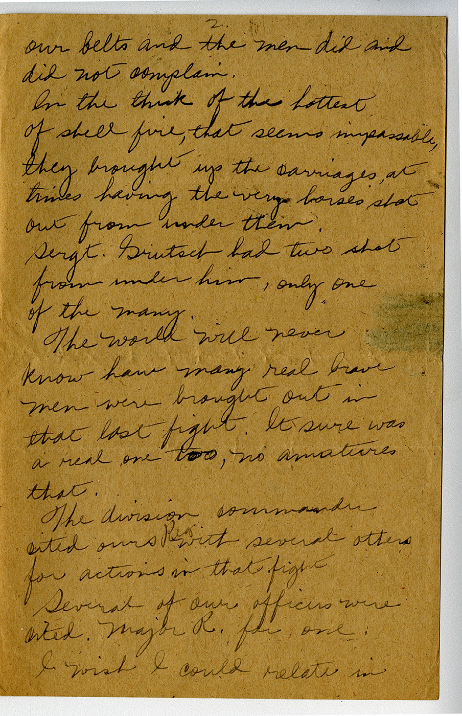 [Page 2] our belts and the men did and did not complain. In the thick of the hottest of shell fire, that seems impassable, they brought up the savages, at times having the very horses shot out from under them. Sergt. Britsel had two shot from under him, only one of the many. The world will never know how many real brave men were brought out in that last fight. It sure was a real one too, no amateurs that. The division commander cited ours Reg. with several others for actions in that fight Several of our officers were cited. Major R. for one I wish I could relate in