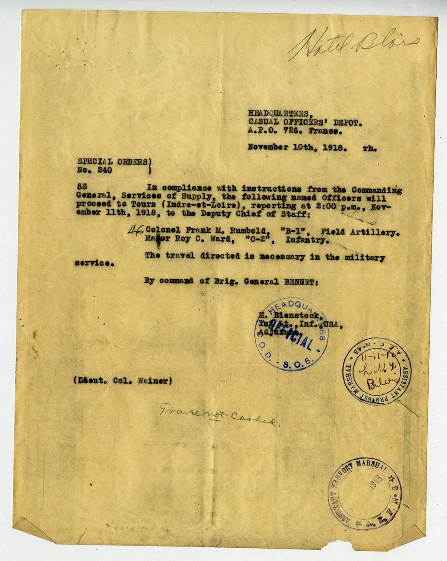 M. Bienstock Special Orders No. 240 - November 10, 1918