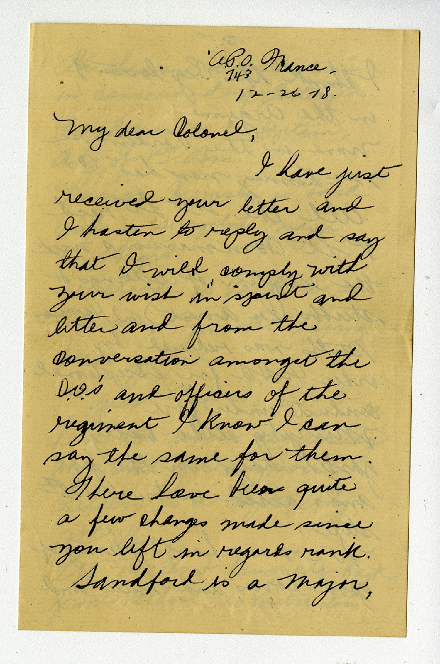 A.P.O. France 743 12-26-[1918]. My dear Colonel, I have just received your letter and I hasten to reply and say that I will comply with your wish in [ms illegible: 1 wd] and letter and from the conversation amongst the D.O.