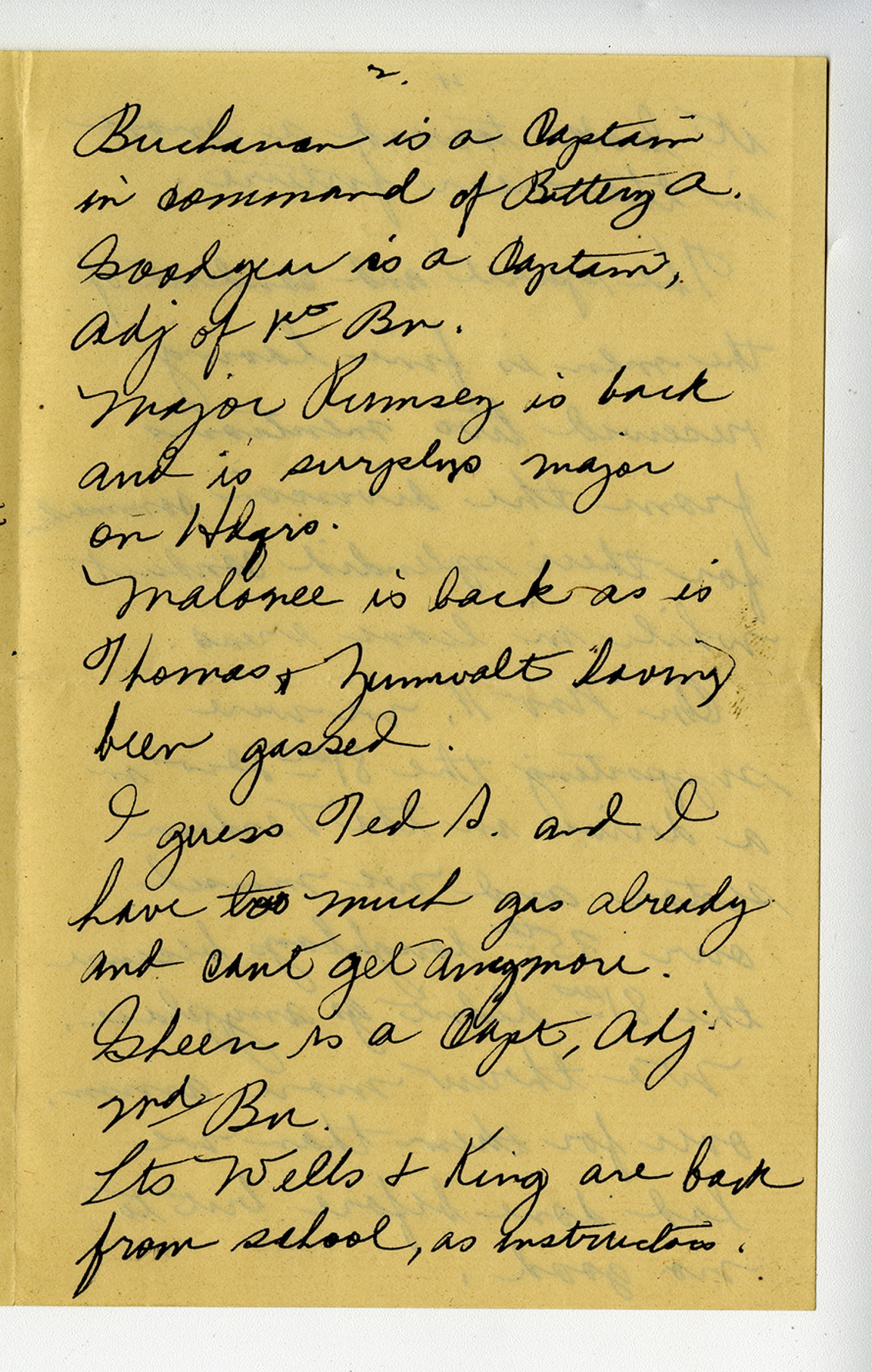 [page 2] Buchanan is a Captain in command of Battery A. Goodyear is a Captain, Adj of 1st Bn. Major Rumsey is back and is surplus major on Hdqrs. Malonee is back as is Thomas & Zumwalt having been gassed. I guess Ted S. and I have too much gas already and cant get anymore. Gheen is a Capt, Adj 2nd Bn. Lts Wells & King are back from school, as instructors.