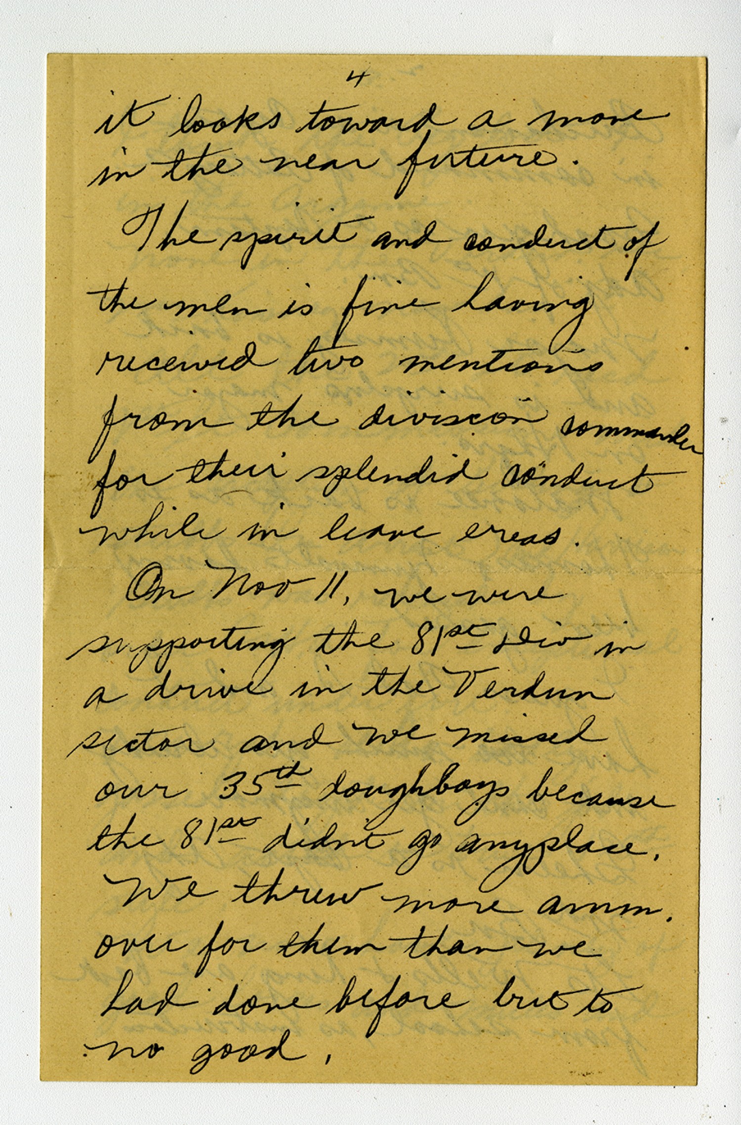 [page 4] it looks toward a move in the near future. The spirit and conduct of the men is fine having received two mentions from the division commander for their splendid conduct while in leave areas. On [November] 11, we were supporting the 81st Div in a drive in the Verdun sector and we missed our 35th doughboys because the 81st didnt go anyplace. We threw more amm. over for them than we had done before but to no good.