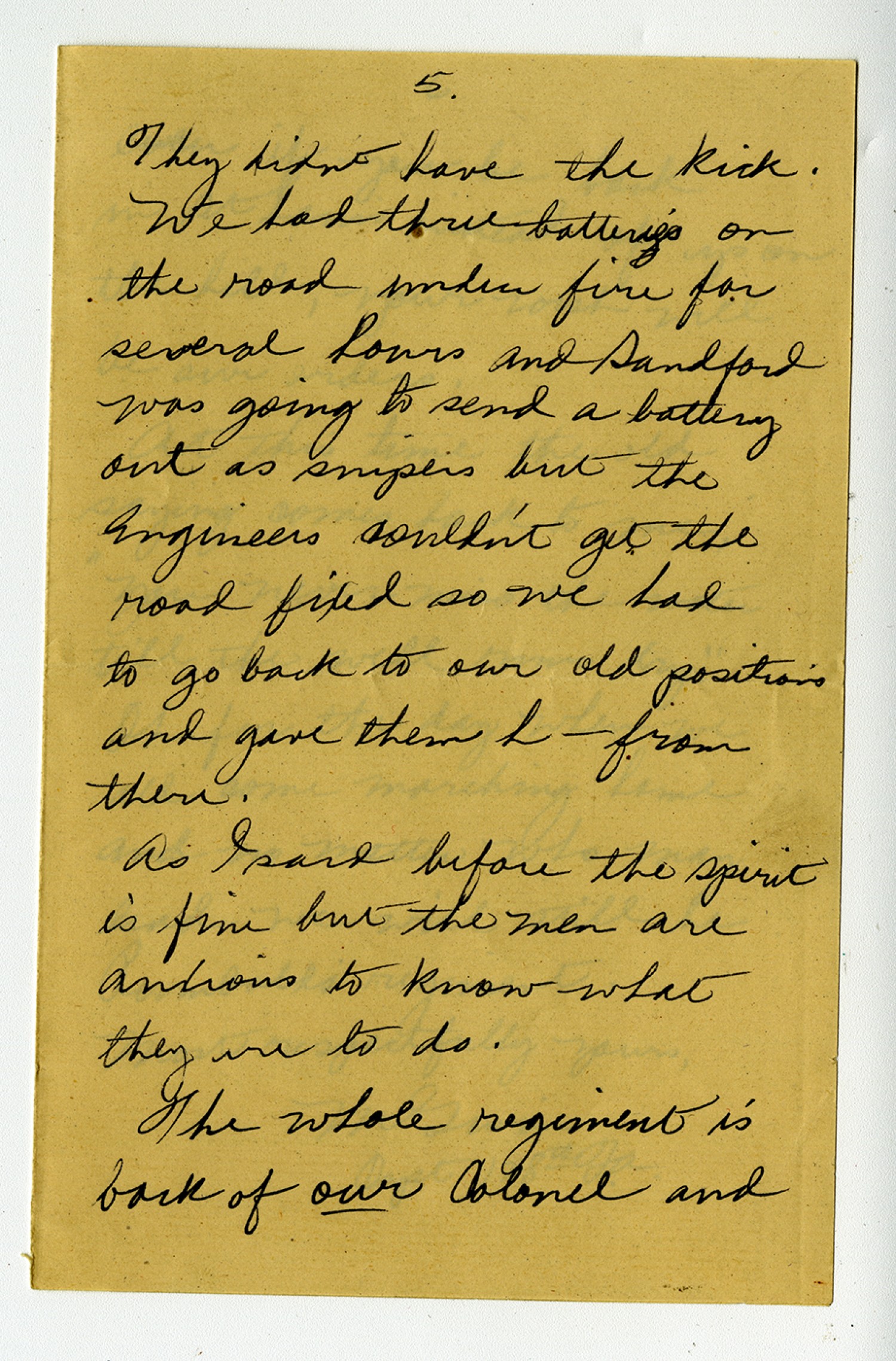 [page 5] They didnt have the kick. We had three batteries on the road under fire for several hours and Sandford was going to send a battery out as snipers but the Engineers couldn