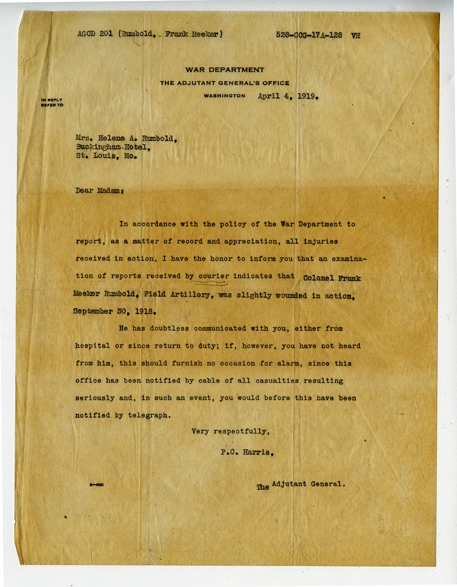 [War Department letterhead] AGCD 201 (Rumbold, Frank Meeker) 528-CCG-17A-128 VH April 4, 1919. Mrs. Helene A. Rumbold, Buckingham Hotel, St. Louis, [Missouri] Dear Madam: In accordance with the policy of the War Department to report, as a matter of record and appreciation, all injuries received in action, I have the honor to inform you that an examination of reports received by courier indicates that Colonel Frank Meeker Rumbold, Field Artillery, was slightly wounded in action, September 30, 1918. He has doubtless communicated with you, either from hospital or since return to duty; if, however, you have not heard from him, this should furnish no occasion for alarm, since this office has been notified by cable of all casualties resulting seriously and, in such an event, you would before this have been notified by telegraph, Very respectfully, P.C. Harris, The Adjutant General.