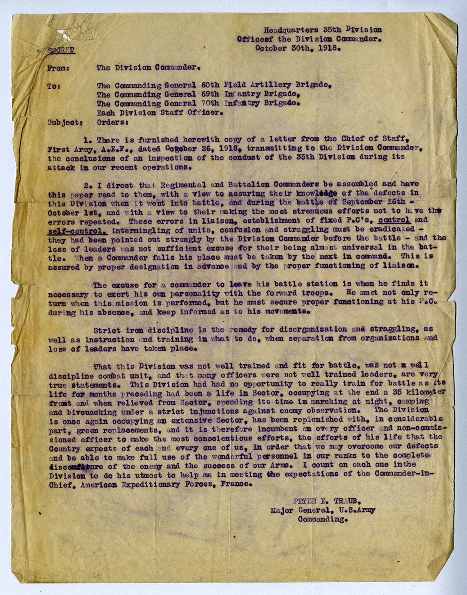 Headquarters 35th Division Officeof the Division Commander. October 30th, 1918. SECRET From: The Division Commander. To: The Commanding General 60th Field Artillery Brigade, The Commanding General 69th Infantry Brigade, The Commanding General 70th Infantry Brigade. Each Division Staff Officer. Subject: Orders: 1. There is furnished herewith copy of a letter from the Chief of Staff, First Army, A.E.F., dated October 26, 1918, transmitting to the Division Commander, the conclusions of an inspection of the conduct of the 35th Division during its attack in our recent operations. 2. I direct that Regimental and Battalion Commanders be assembled and have this paper read to them, with a view to assuring their knowledge of the defects in this Division when it went into battle, and during the battle of September 26th