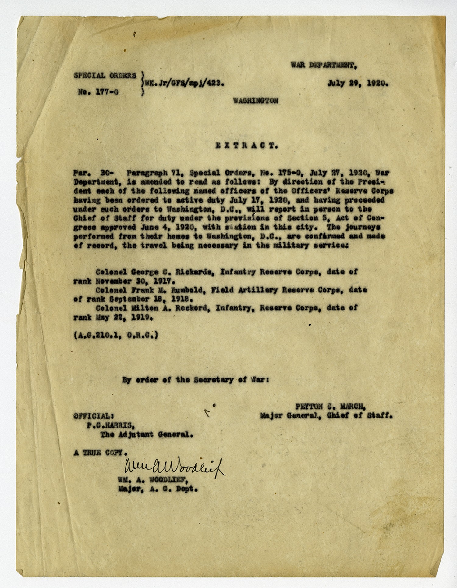 SPECIAL ORDERS No. 177-0) Wk.Jr/GFS/mpj/423 WAR DEPARTMENT July 29, 1920. WASHINGTON EXTRACT. Par. 30- Paragraph 71, Special Orders, No. 175-0, July 27, 1920, War Department, is amended to read as follows: By direction of the President each of the following named officers of the Officers