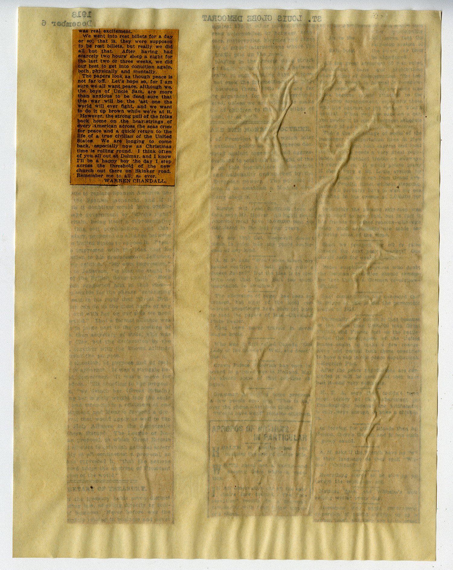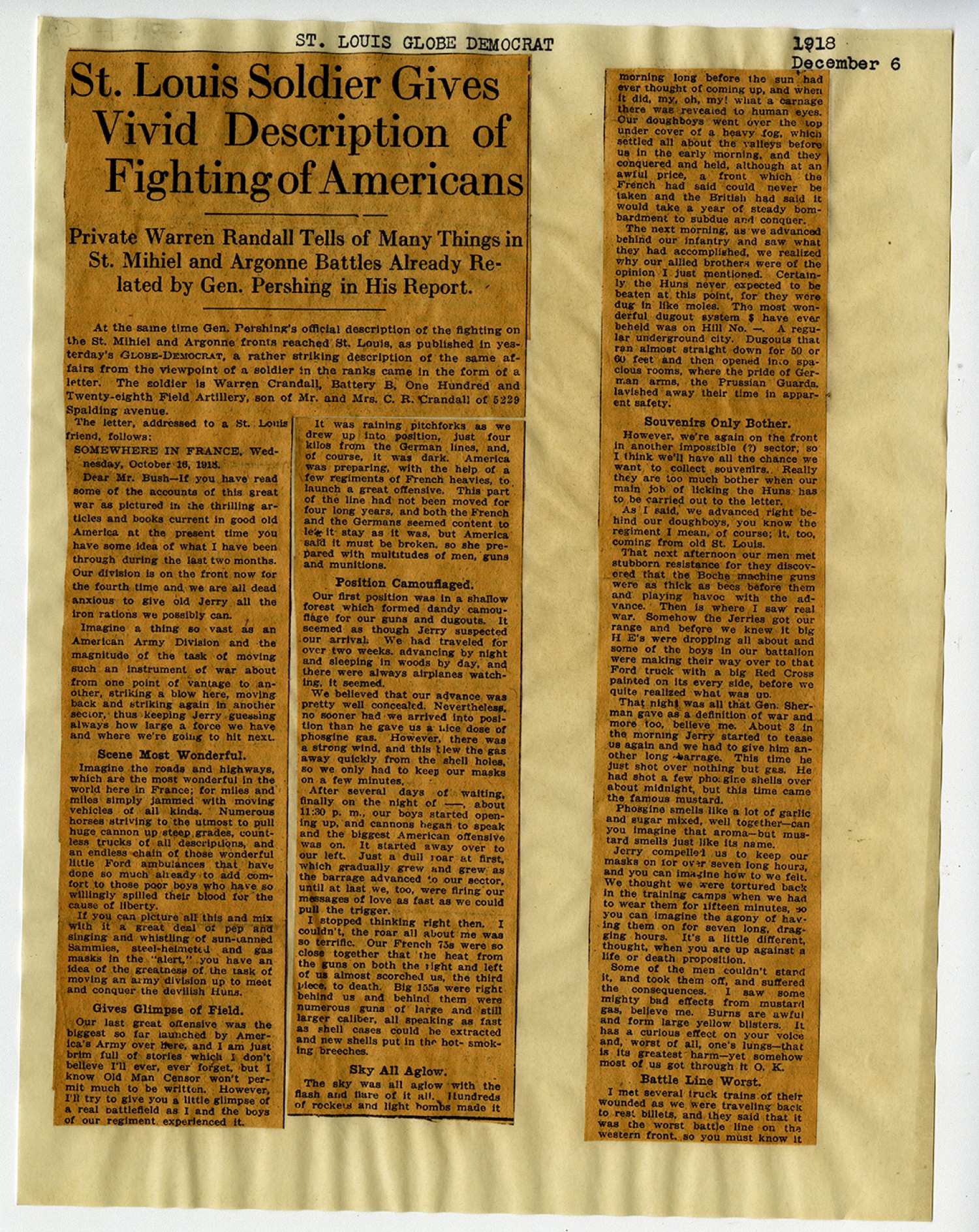 | Description | This newspaper article features a letter from Warren Crandall of Battery B, 128th Field Artillery. He writes to his parents telling of the fierce fighting he has experienced in the Argonne Forest. Frank Meeker Rumbold served as Colonel of the 128th Field Artillery during World War I. He later served as Adjutant General of Missouri from 1925 to 1927. |