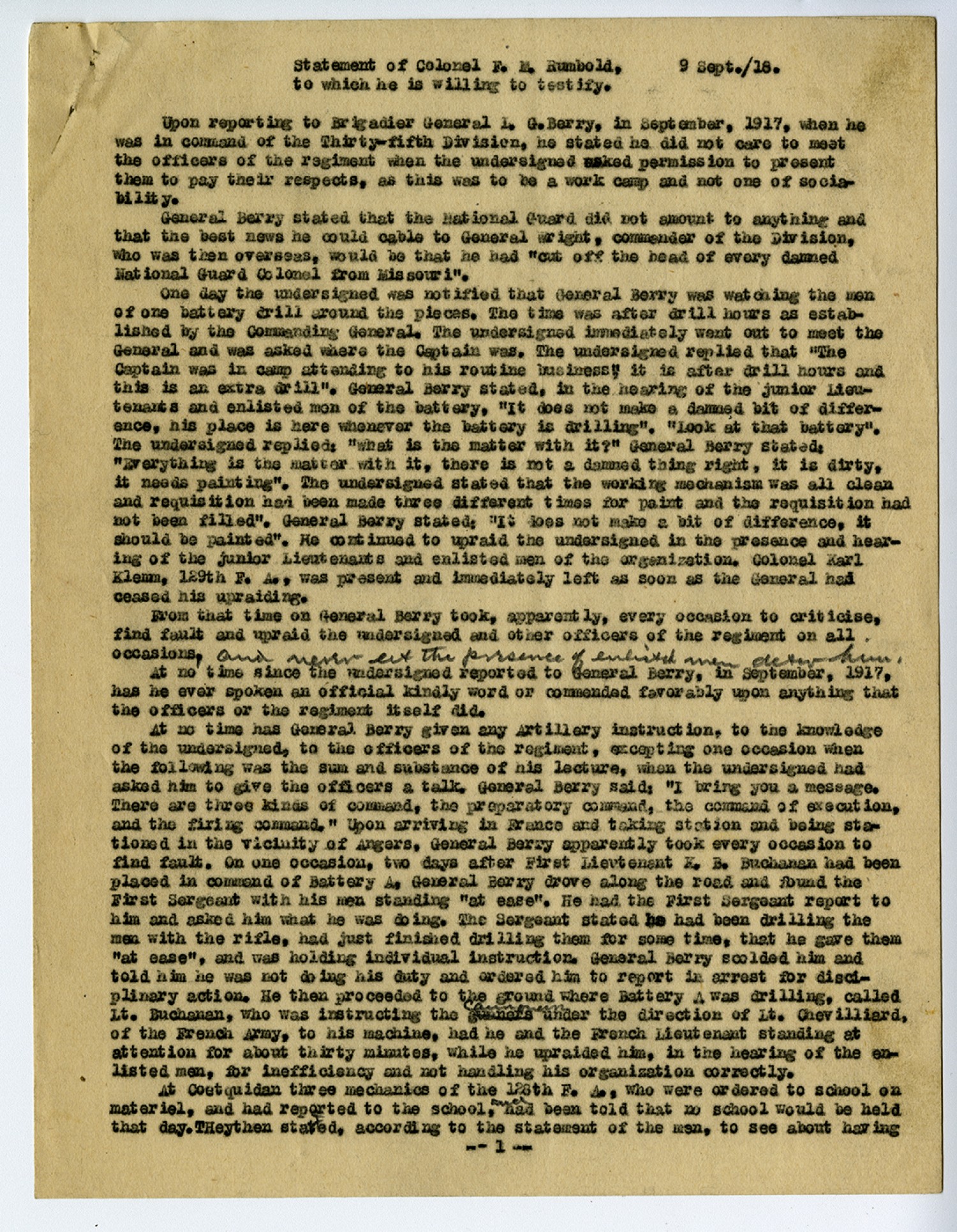 Statement of Colonel F.M. Rumbold, to which he is willing to testify. 9 [September 1918]. Upon reporting to Brigadier General L. G. Berry, in September 1917, when he was in command of the Thirty-fifth Division, he stated he did not care to meet the officers of the regiment when the undersigned asked permission to present them to pay their respects, as this was to be a work camp and not one of sociability. General Berry stated that the National Guard did not amount to anything and that the best news he could cable to General Wright, commander of the Division, who was then overseas, would be that he had