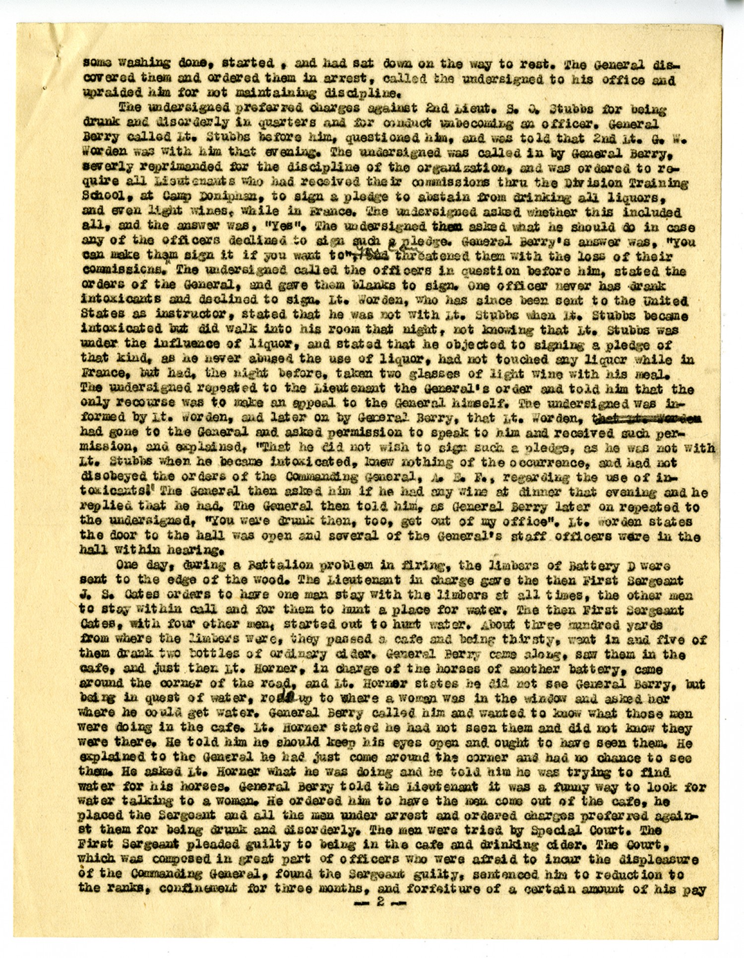 some washing done, started, and had sat down on the way to rest. The General discovered them and ordered them in arrest, called the undersigned to his office and upraided him for not maintaining discipline. The undersigned preferred charges against 2nd Lieut. S.O. Stubbs for being drunk and disorderly in quarters and for conduct unbecoming an officer. General Berry called Lt. Stubbs before him, questioned him, and was told that 2nd Lt. G.W. Worden was with him that evening. The undersigned was called in by General Berry, severely reprimanded for the discipline of the organization, and was ordered to require all Lieutenants who had received their commissions thru the Division Training School, at Camp Doniphan, to sign a pledge to abstain from drinking all liquors, and even lights wines, while in France. The undersigned asked whether this included all, and the answer was,