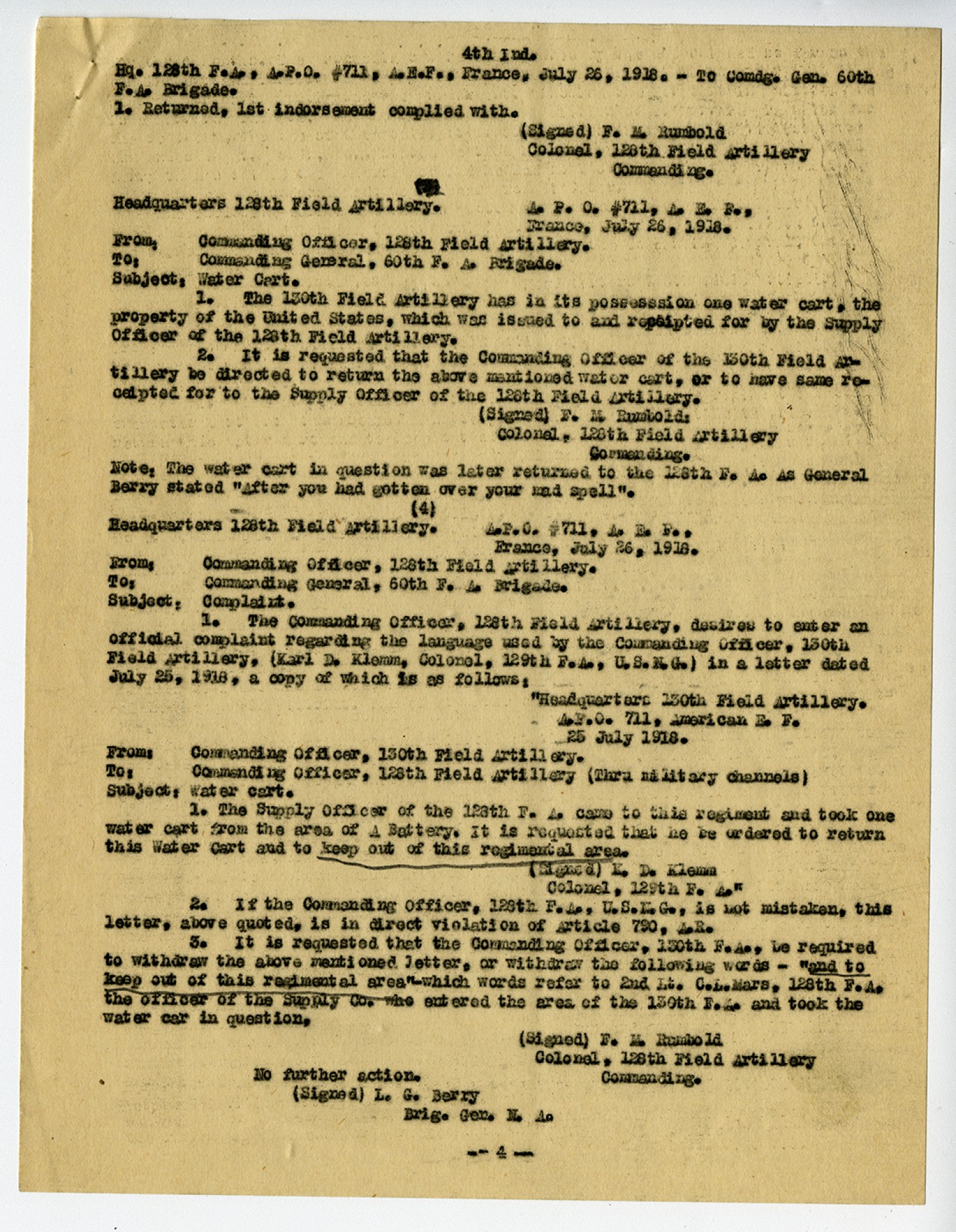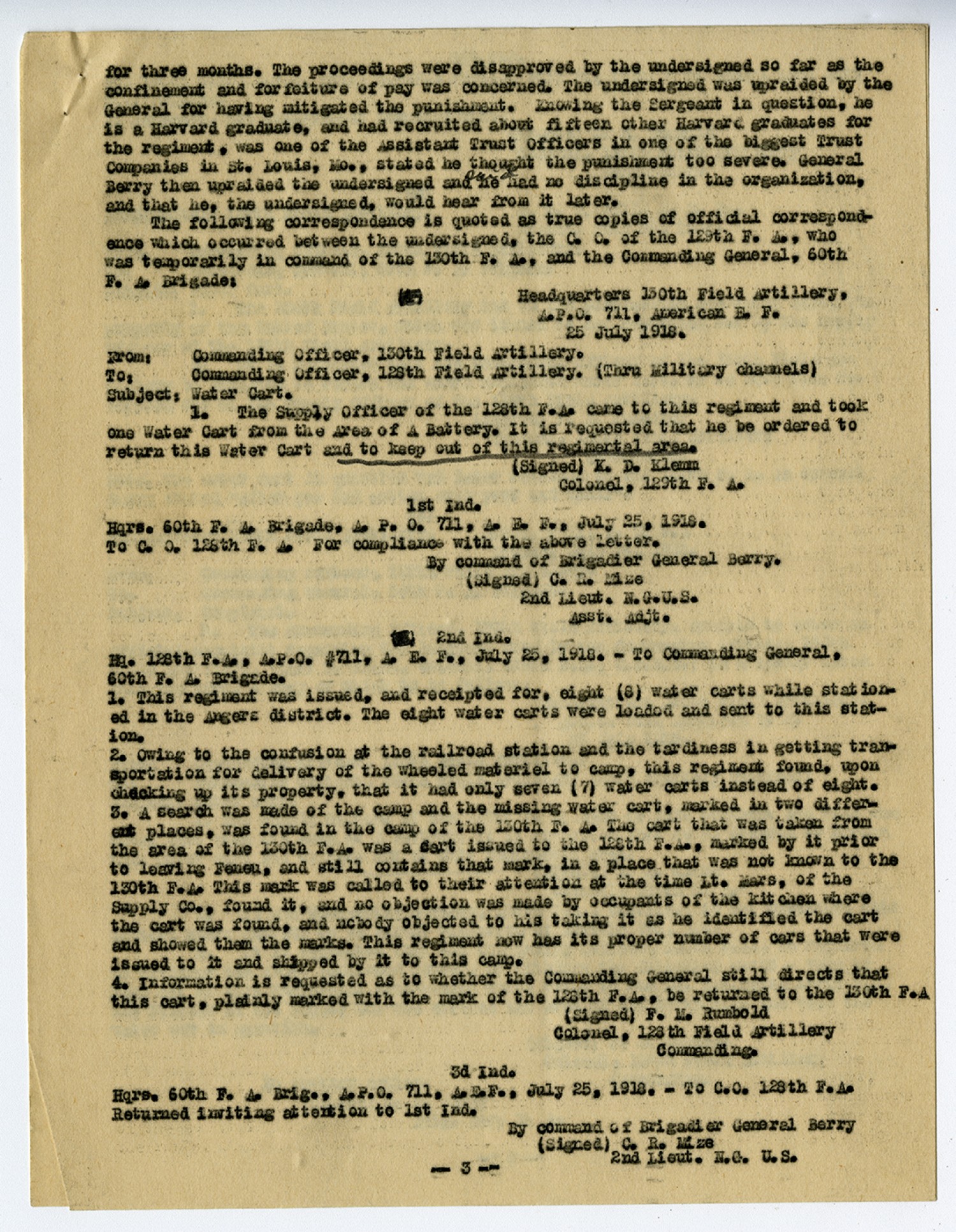 for three months. The proceedings were disapproved by the undersigned so far as the confinement and forfeiture of pay was concerned. The undersigned was upraided by the Geenral for having mitigated the punishment. Knowing the Sergeant in question, he is a Harvard graduate, and had recruited about fifteen other Harvard graduates for the regiment, was one of the Assistant Trust Officers in one of the biggest Trust Companies in St. Louis, [Missouri], stated he thought the punishment too severe. General Berry then upraided the undersigned and said he had no discipline in the organization, and that he, the undersigned, would hear from it later. The following correspondence is quoted as true copies of official correspondence which occurred between the undersigned, the C.O. of the 129th F.A., who was temporarily in command of the 130th F.A., and the Commanding General, 60th F.A. Brigade: Headquarters 130th Field Artillery, A.P.O. 711, American E.F. 25 July 1918. From Commanding Officer, 130th Field Artillery. To: Commanding Officer, 128th Field Artillery. (Thru Military channels) Subject: Water Cart. 1. The Supply Officer of the 128th F.A. came to this regiment and took one Water Cart from the Area of A Battery. It is requested that he be ordered to return this Water Cart and to keep out of this regimental area. (Signed) K.D. Klemm Colonel, 129th F.A. 1st Ind. Hqrs. 60th F.A. Brigade. A.P.O. 711, A.E.F., July 25, 1918. To C.O. 128th F.A. For compliance with the above letter. By command of Brigadier General Berry. (Signed) C.R. Mize 2nd Lieut. N.G.U.S. Asst. Adjt. 2nd Ind. Hq. 128th F.A., A.P.O. #711, A.E.F., July 25, 1918.