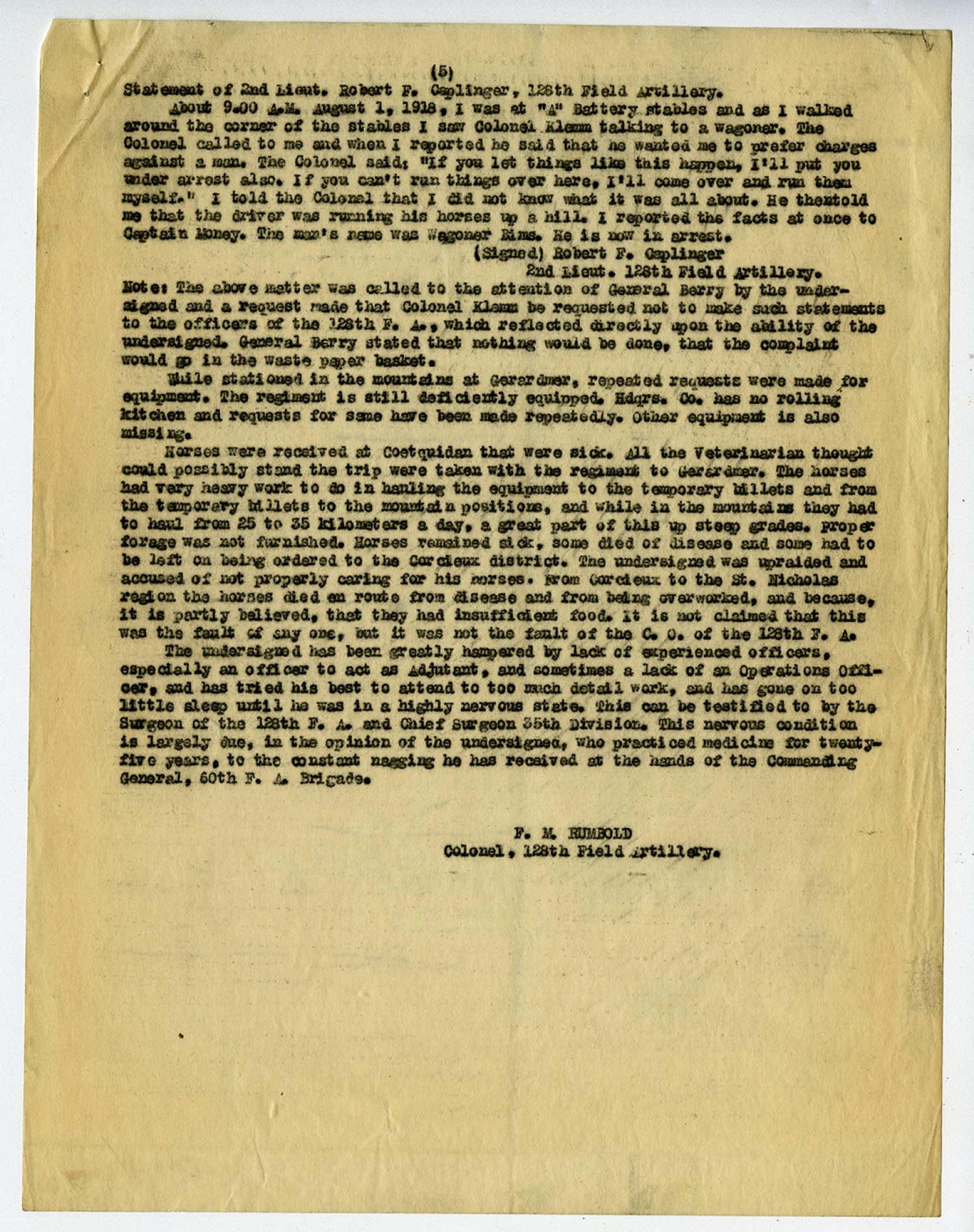 (5) Statement of 2nd Lieut. Robert F. Caplinger, 128th Field Artillery. About 9.00 A.M. August 1, 1918, I was at