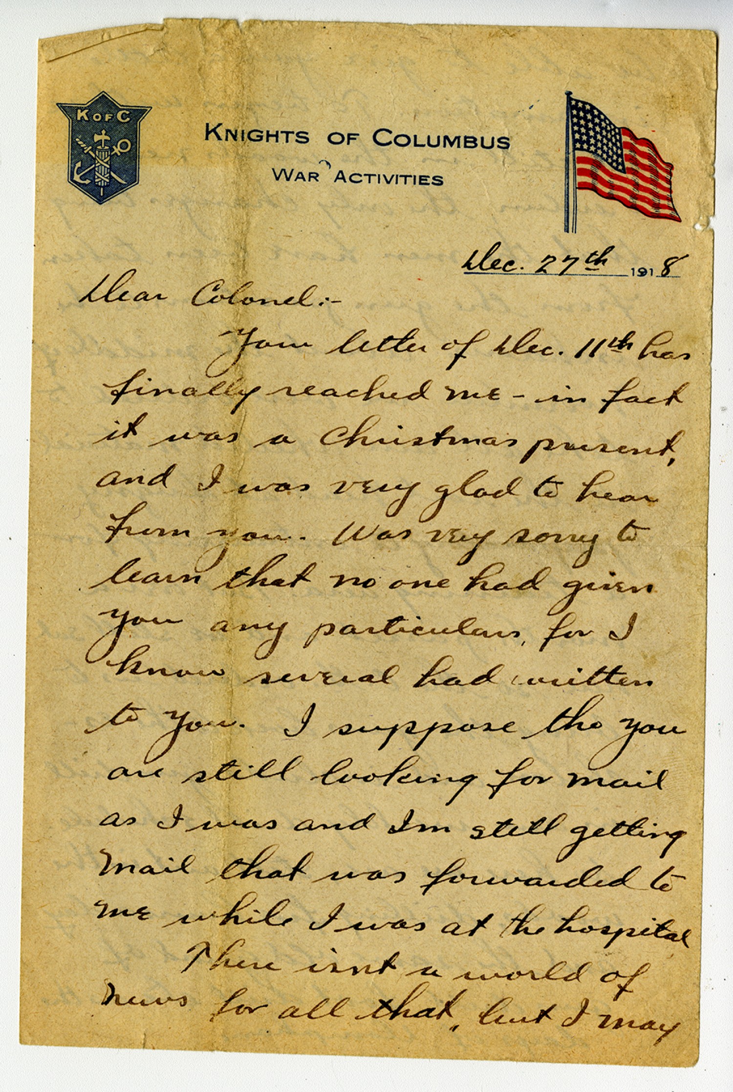 [Knights of Columbus letterhead] [December] 27th 1918 Dear Colonel:- Your letter of [December] 11th has finally reached me
