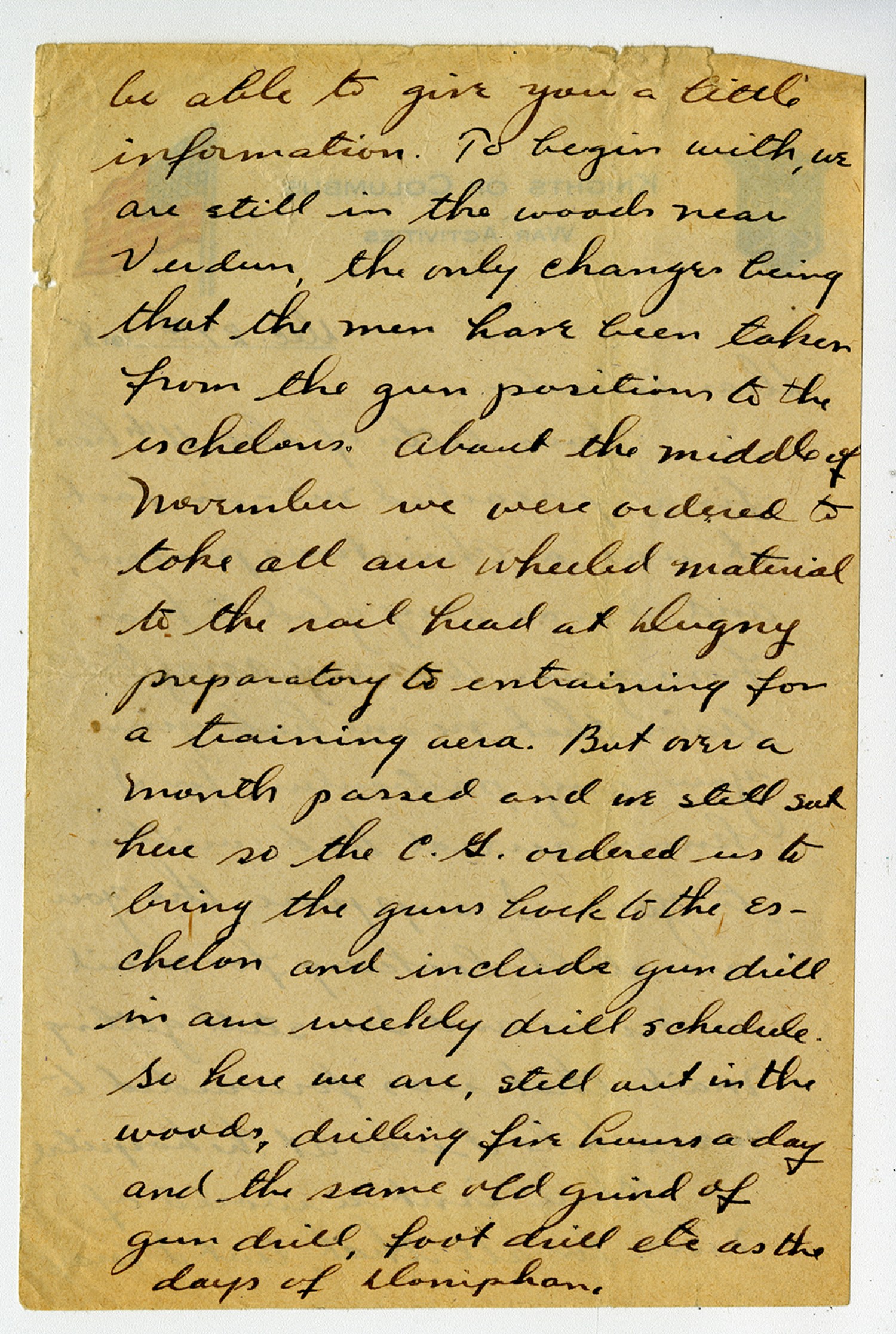 be able to give you a little information. To begin with, we are still in the woods near Verdun, the only changes being that the men have been taken from the gun positions to the echelons. About the middle of November we were ordered to take all our wheeled material to the rail head at Dugny preparatory to entraining for a training aera. But over a month passed and we still sat here so the C.G. ordered us to bring the guns back to the eschelon and include gun drill in our weekly drill schedule. So here we are, still out in the woods drilling five hours a day and the same old grind of gun drill, foot drill etc as the days of Doniphan.
