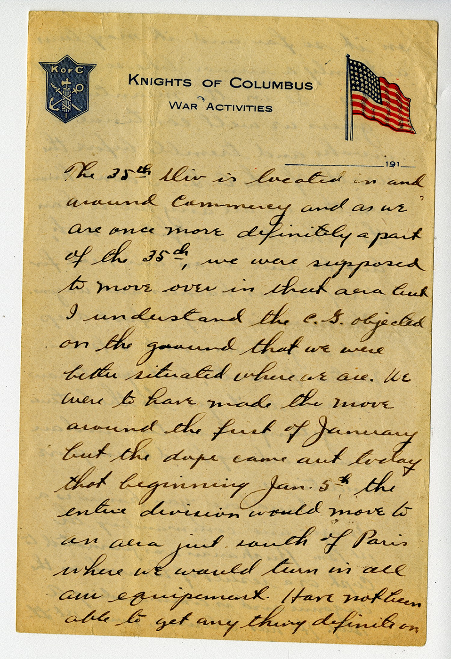 [Knights of Columbus letterhead] The 35th Div is located in and around Commency and as we are once more definitely a part of the 35th, we were supposed to move over in that aera but I understand the C.G. objected on the ground that we were better situated where we are. We were to have made the move around the first of January but the dope came out today that beginning [January] 5th the entire division would move to an aera just south of Paris where we would turn in all our equipment. I have not been able to get any thing definite on