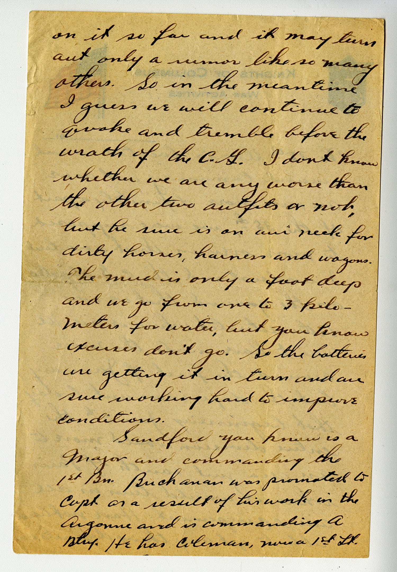 on it so far and it may turn out only a rumor like so many others. So in the meantime I guess we will continue to quake and tremble before the wrath of the C.G. I dont know whether we are any worse than the other two outfits or not, but he sure is on our neck for dirty horses, harness and wagons. The mud is only a foot deep and we go from one to 3 kilometers for water, but you know excuses don