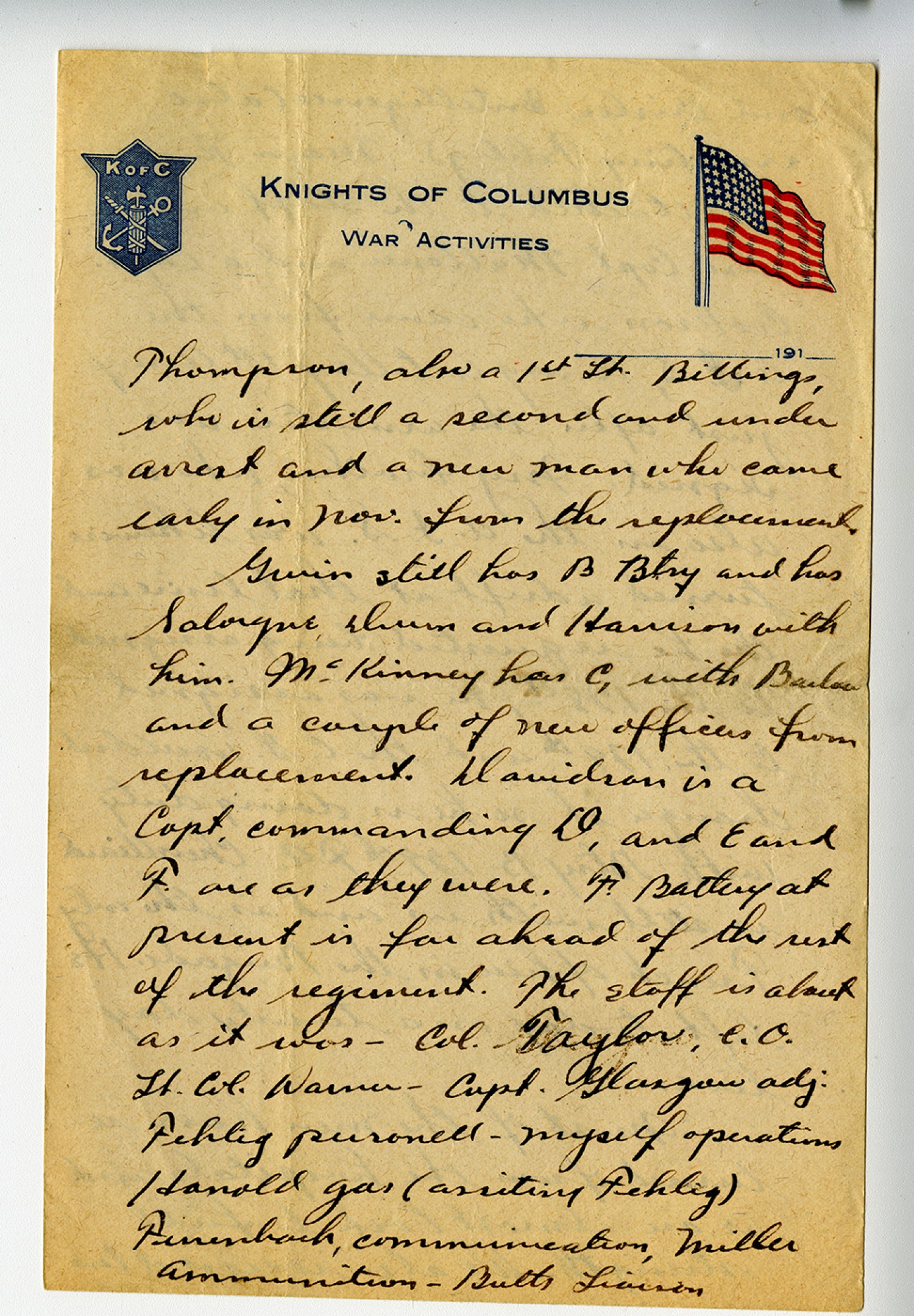 [Knights of Columbus letterhead] Thompson, also a 1st Lt. Billings, who is still a second and under arrest and a new man who came early in [November] from the replacement. Givin still has B Btry and has Salongne, [ms illegible: 1 wd] and Harrison with him. McKinney has C, with Barlow and a couple of new officers from replacement. Davidson is a Capt, commanding D, and E and F are as they were. F Battery at present is far ahead of the rest of the regiment. The staff is about as it was