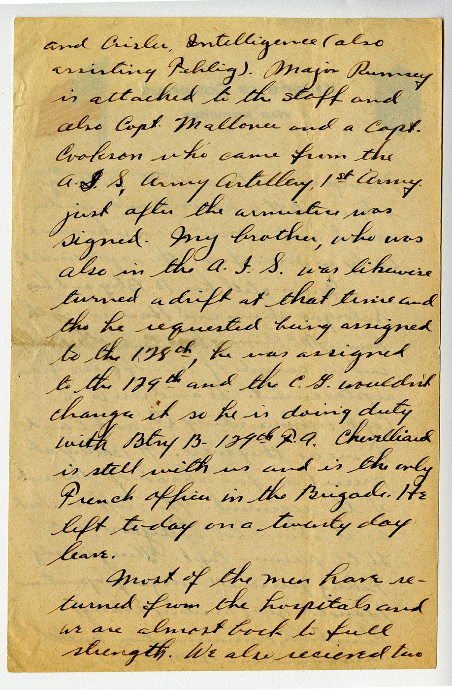 and Crisler intelligence (also assisting Fehlig). Major Rumsey is attached to the staff and also Capt. Mallonee and a Capt. Cralson who came from the A.F.S, Army Artillery, 1st Army just after the armistice was signed. My brother, who was also in the A.F.S. was likewise turned adrift at that time and tho he requested being assigned to the 128th, he was assigned to the 129th and the C.G. wouldn