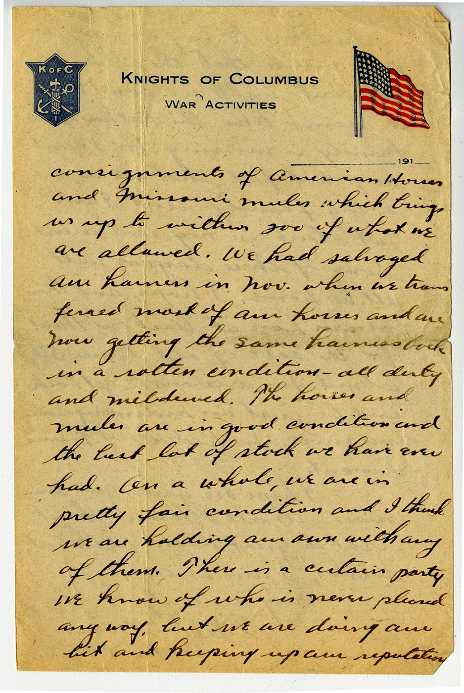 [Knights of Columbus letterhead] consignments of American Horses and Missouri mules which bring us up to within 200 of what we are allowed. We had salvaged our harness in [November] when we transferred most of our horses and are now getting the same harness back in a rotten condition
