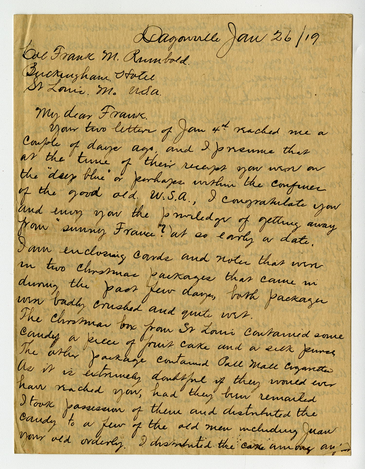 Dagonville [January] 26 [1919] Col Frank M. Rumbold. Buckingham Hotel St. Louis. [Missouri] U.S.A. My dear Frank. Your two letters of [January] 4th reached me a couple of days ago, and I presume that as the time of their receipt you were on the