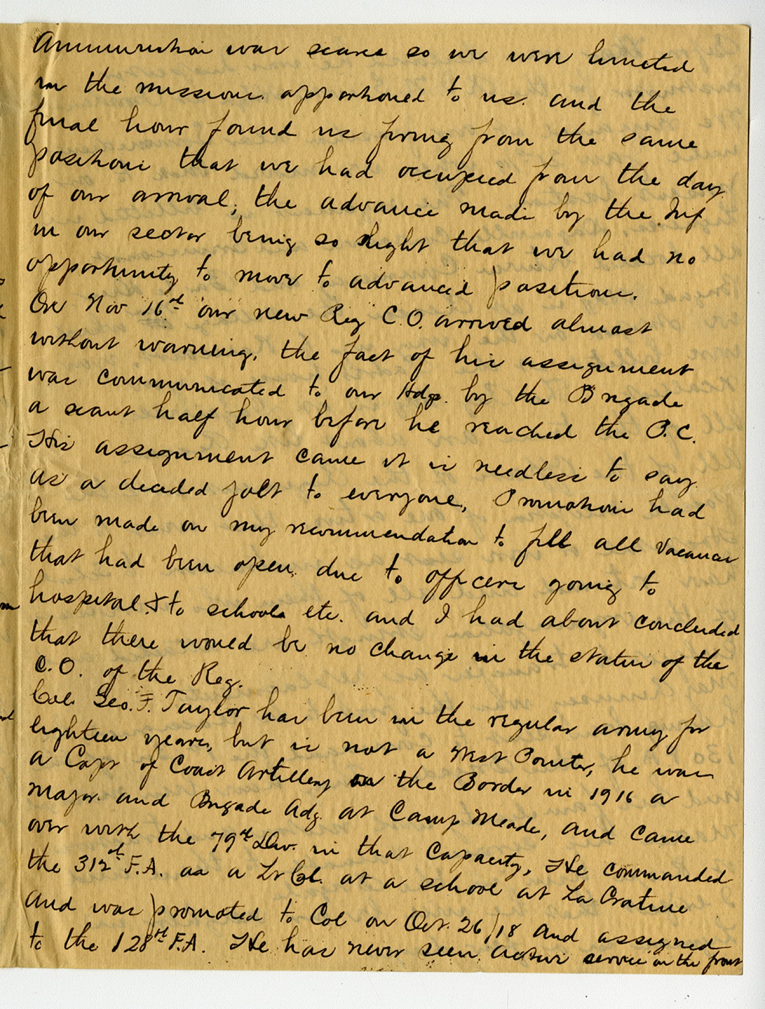 Ammunition was scarce so we were limited in the mission apparent to us and the final hour found us firing from the same position that we had occupied from the day of our arrival; the advance made by the Inf in our sector being so slight that we had no opportunity to move to advanced position. On [November] 16th our new Reg C.O. arrived almost without warning, the fact of his assignment was communicated to our Hdqs by the Brigade a [ms illegible: 1 wd] half hour before he reached the P.C. His assignment came it is needless to say. As a decided [ms illegible: 1 wd] to everyone, [ms illegible: 1 wd] had been made on my recommendation to fill all Vacancies that had been open due to officers going to hospital & to schools etc. and I had about concluded that there would be no change in the station of the C.O. of the Reg. Col. Geo. F. Taylor has been in the regular army for eighteen years, but is not a [ms illegible: 2 wds] he was a Capt of Coast Artillery on the Border in 1916 a Major and Brigade Adg. at Camp Meade, and came over were the 79th Div. in that capacity, He commanded the 312th F.A. as a Lt Col. at a school at La Crature and was promoted to Col on [October] 26, [1918] and assigned to the 128th F.A. He has never seen active service on the front
