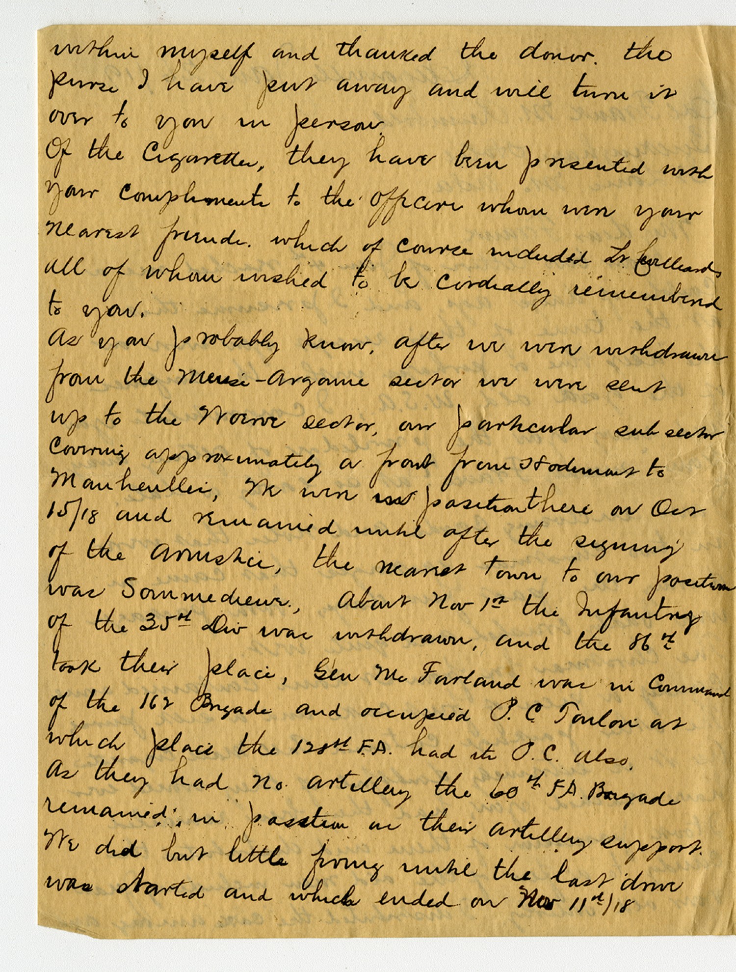 Within myself and thanked the donor the purse I have put away and will turn it over to you in person. Of the Cigarettes, they have been presented with your compliment to the officer whom were your nearest friends. Which of course included Lt Cevlliand, all of whom wished to be cordially remembered to you. As you probably know, after we were withdrawn from the Meuse-Argonne sector we were sent up to the Reserve sector, and particular sub sector covering approximately a front from Hodemaus to Manheuller, We were in position there on [October] 15 [1918] and remained until after the signing of the Armistice, the nearest town to our position was Sommedieue, about [November] 1st the Infantry of the 35th Div was withdrawn, and the 86th took their place, Gen McFarland was in Command of the 162 Brigade and occupied P.C. Taylor at which place the 128th F.A. had its P.C. also. As they had no artillery the 60th FA. Brigade remained in position in their artillery support. We did but little firing [ms illegible: 1 wd] the last drive was started and which ended on [November] 11th [1918]