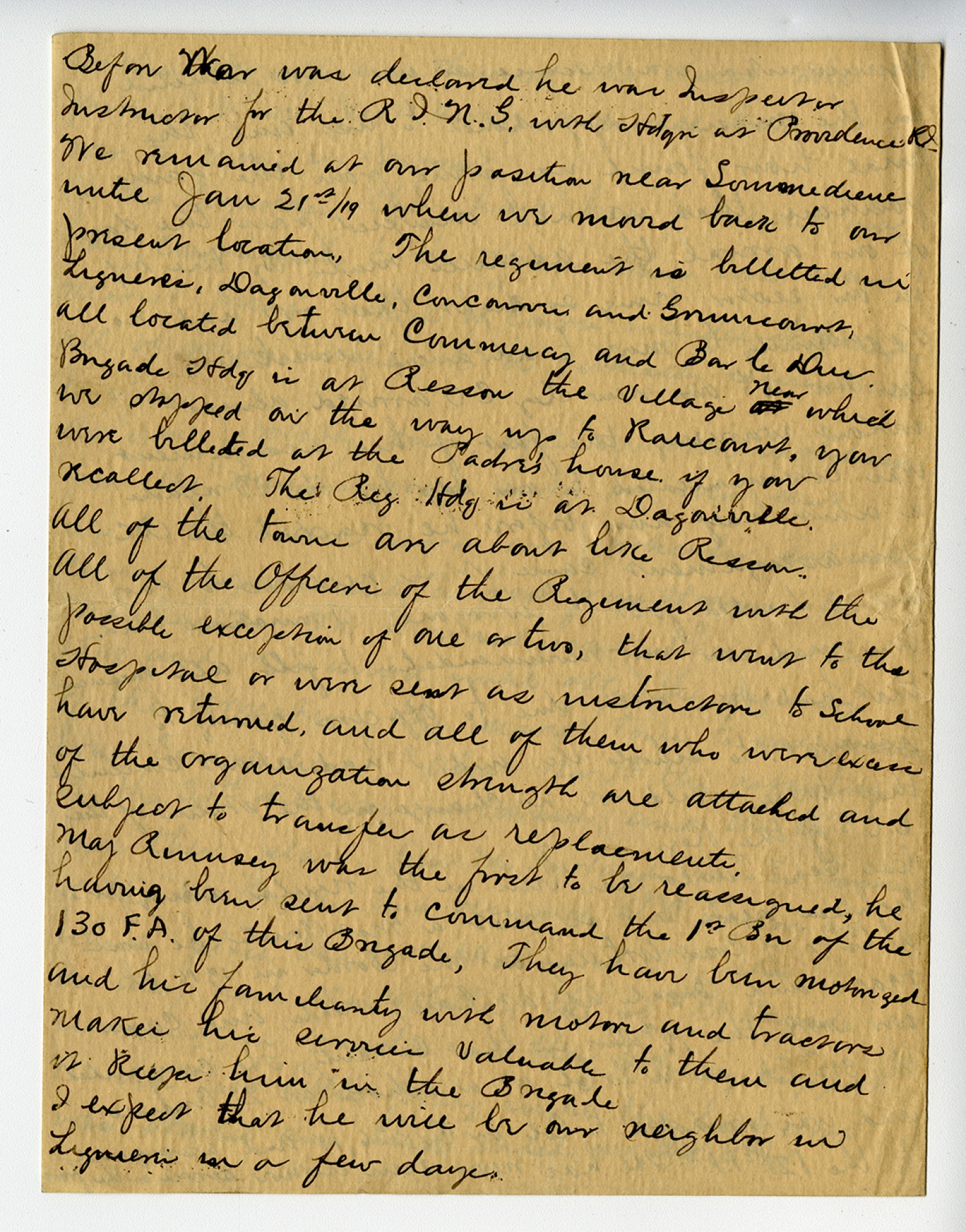 Before war declared he was Inspector Instructor for the R.I.N.G. with Hdq at Providence [Rhode Island] We remained at our position near Sommedieue until [January] 21st [1919] when we moved back to our present location. The regiment is billeted in Ligneres, Dagonville, Concarneau and [ms illegible: 1 wd], all located between Commency and Bar le Duc. Brigade Hdq is at Resson the Village near which we stopped on the way up to Rancourt, you were billeted at the Padre