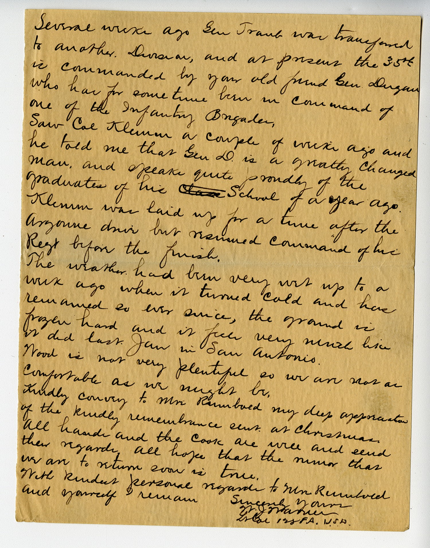 Several weeks ago Gen Traub was transferred to another Division, and at present the 35th is commanded by your old friend Gen Dugan who has for some time been in command of one of the Infantry Brigades, Saw Col Klemm a couple of weeks ago and he told me that Gen D. is a greatly changed man, and speaks quite proudly of the graduates of his School of a year ago. Klemm was laid up for a time after the Argonne drive but resumed command of his Regt before the finish. The weather had been very wet up to a week ago when it turned cold and has remained so ever since, the ground is frozen hard and it feels very muck like it did last [January] in San Antonio. Wood is not very plentiful so we are not as comfortable as we might be. Kindly convey to Mrs Rumbold my deep appreciation of the kindly remembrance sent at Christmas. All [ms illegible: 1 wd] and the cook are well and send their regards. All hope that the rumor that we are to return soon is true. With [kindest personal regard to Mrs Rumbold and yourself I remain Sincerely Yours W. J. Warner Lt. Col 128 F. A. U.S.A.