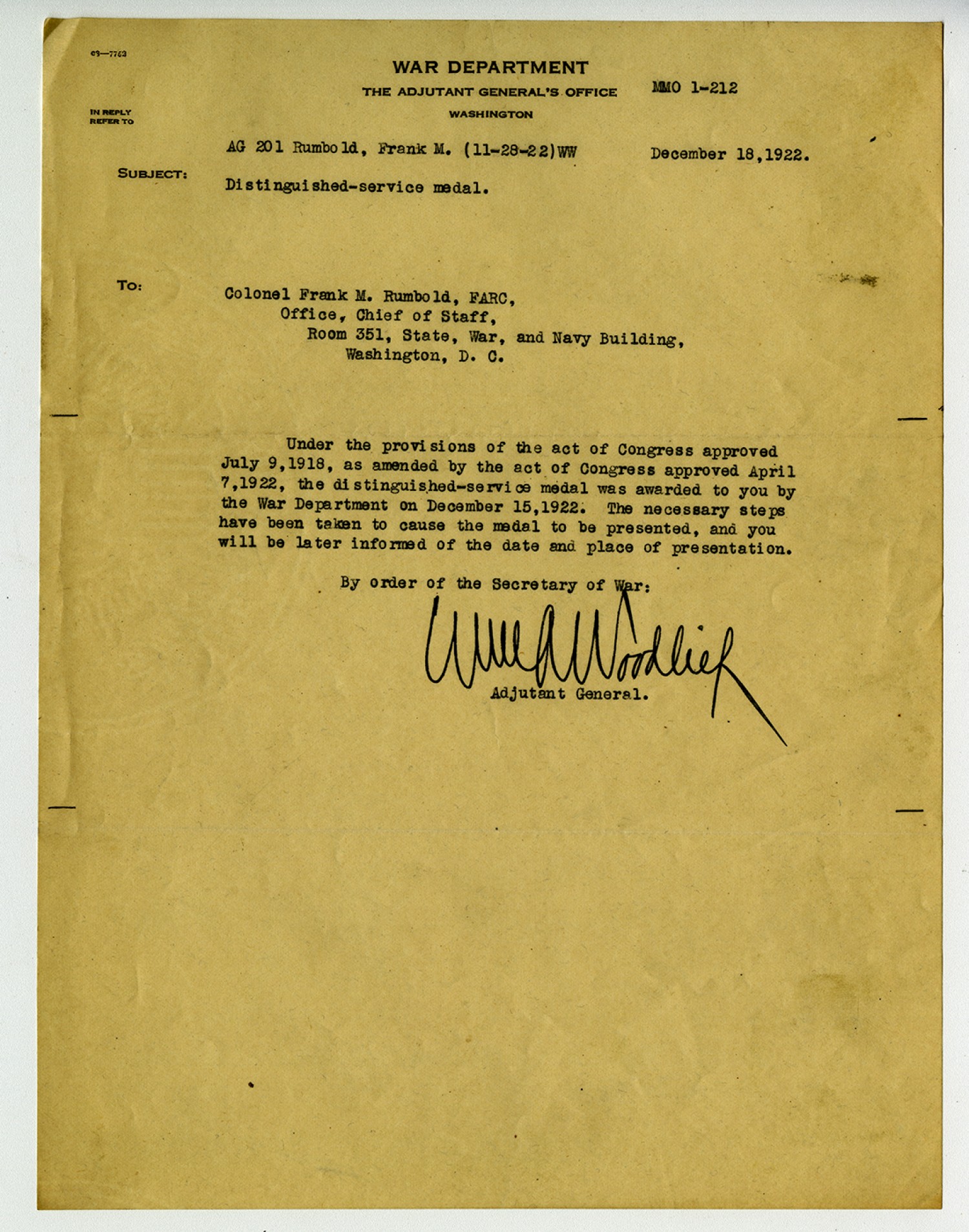 [War Department letterhead] MMO 1-212 AG 201 Rumbold, Frank M. (11-28-22) WW December 18, 1922. Subject: Distinguished-service medal. To: Colonel Frank M. Rumbold, FARC, Office, Chief of Staff, Room 351, State, War, and Navy Building, Washington, D.C. Under the provisions of the act of Congress approved July 9, 1918, as amended by the act of Congress approved April 7, 1922, the distinguished-service medal was awarded to you by the War Department on December 15, 1922. The necessary steps have been taken to cause the medal to be presented, and you will be later informed of the date and place of presentation. By order of the Secretary of War: William A. Woodlief Adjutant General.