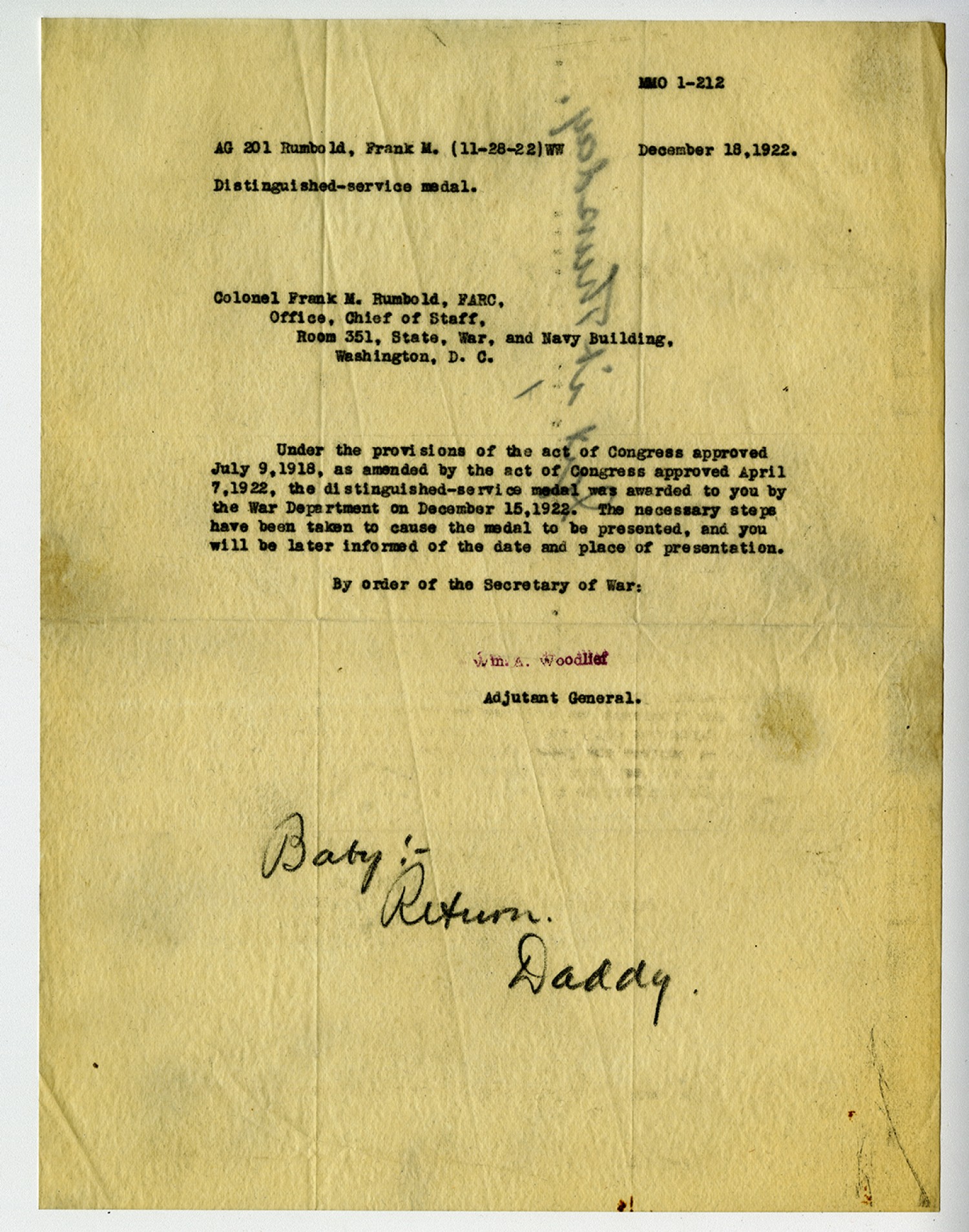 MMO 1-212 AG 210 Rumbold, Frnk M. (11-28-22) WW December 18, 1922. Distinguished-service medal. Colonel Frank M. Rumbold, FARC, Office, Chief of Staff, Room 351, State, War, and Navy Building, Washington, D.C. Under the provision of the act of Congress approved July 9, 1918, as amended by the act of Congress approved April 7, 1922, the distinguished-service medal was awarded t you by the War Department on December 15, 1922. The necessary steps have been taken to cause the medal to be presented, and you will be later informed of the date and place of presentation. By order of the Secretary of War: Wm. A. Woodlief Adjutant General. Baby:- Return. Daddy.