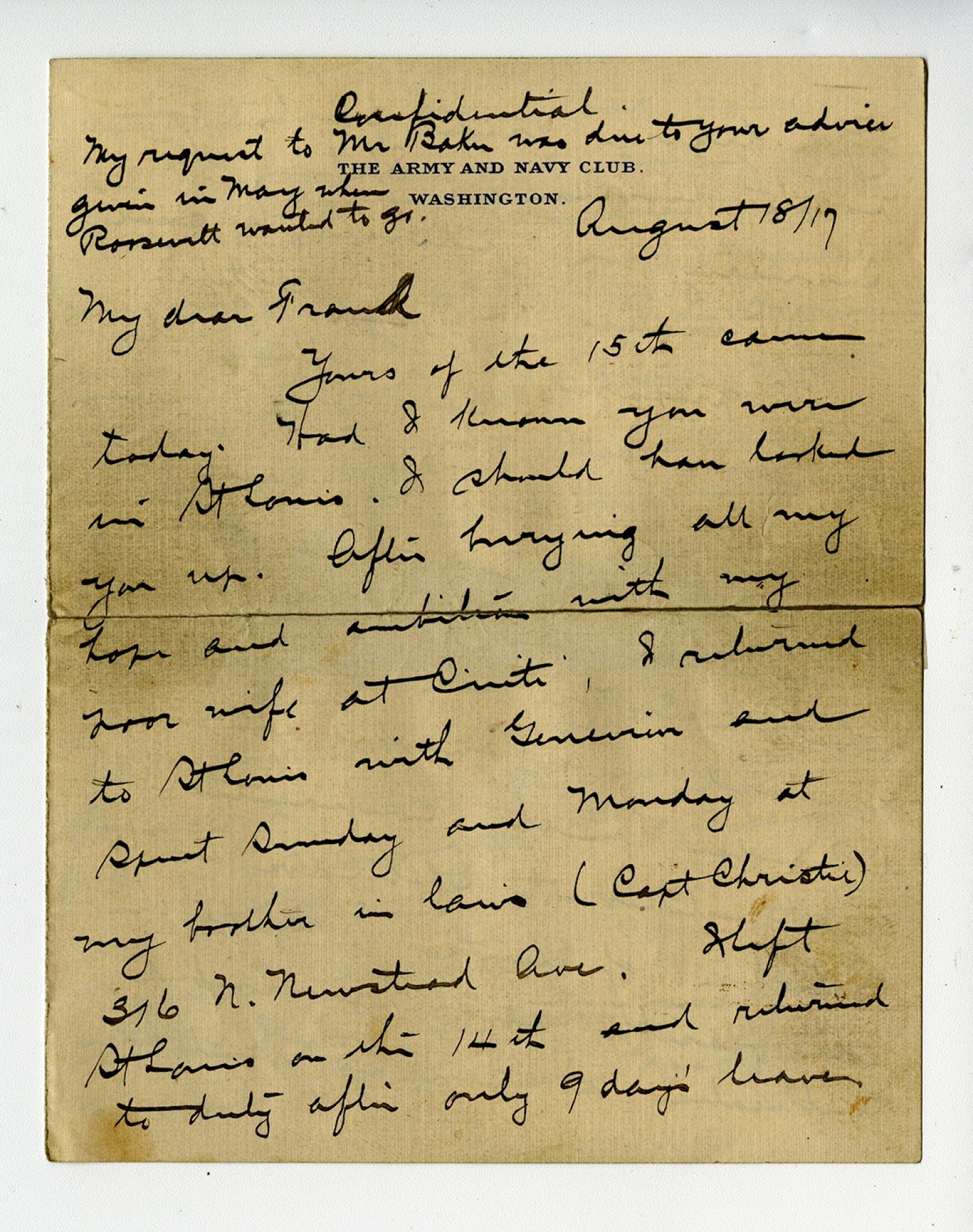 [The Army and Navy Club letterhead] Confidential. My request to Mr Baker was due to your advice given in May when Roosevelt wanted to go. August 18/[1917] My dear Frank Yours of the 15th came today. Had I known you were in St. Louis I should have looked you up. After hurrying all my hope and ambition with my poor wife at [ms illegible: 1wd], I returned to St Louis with Genevieve and spent Sunday and Monday at my brother in law
