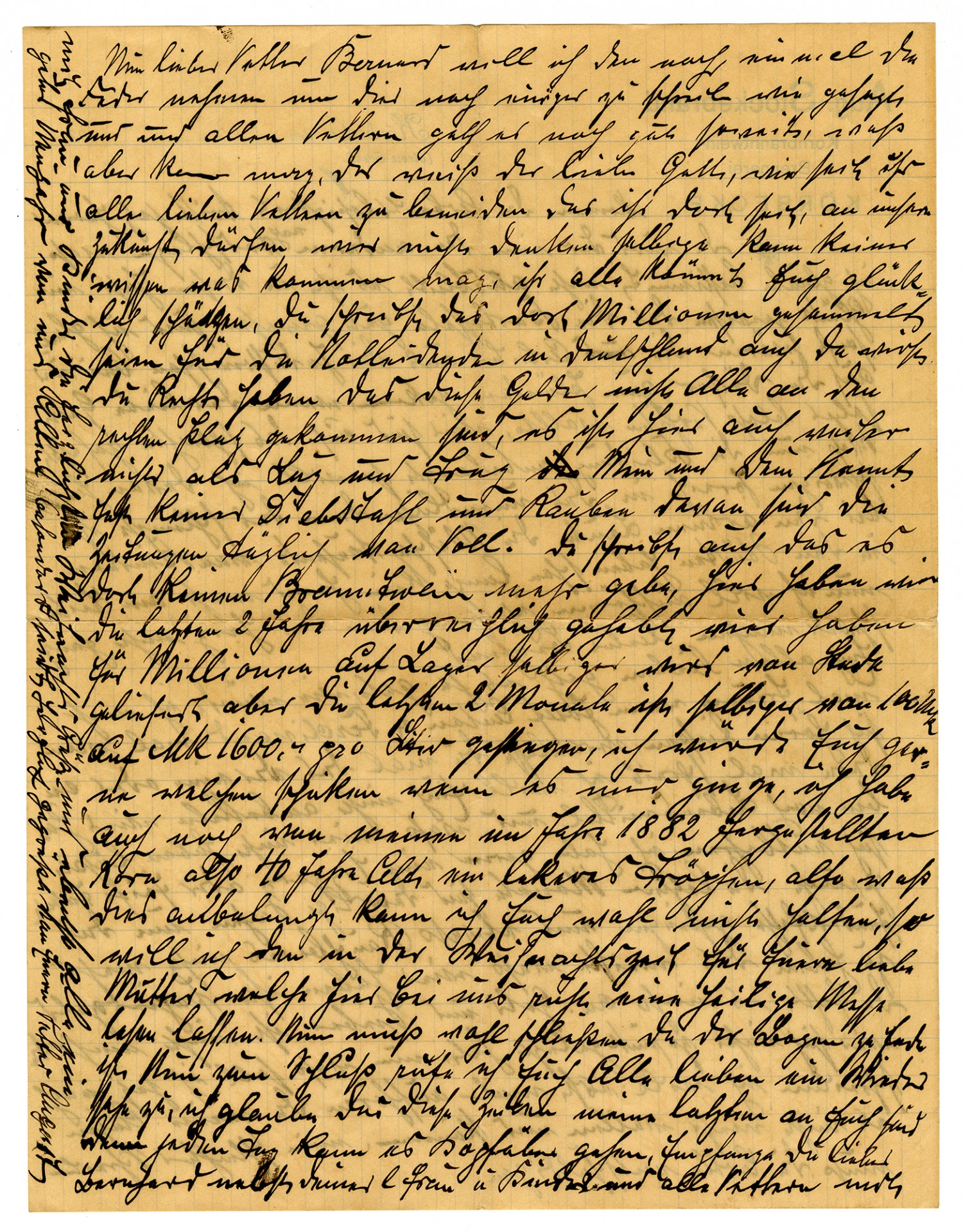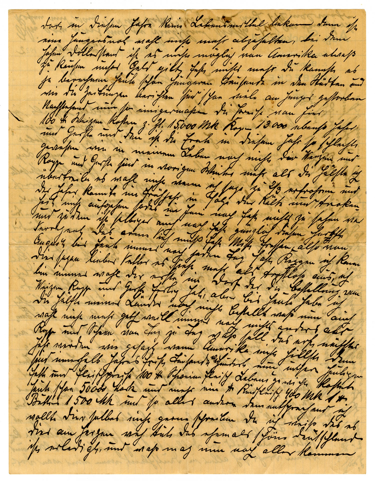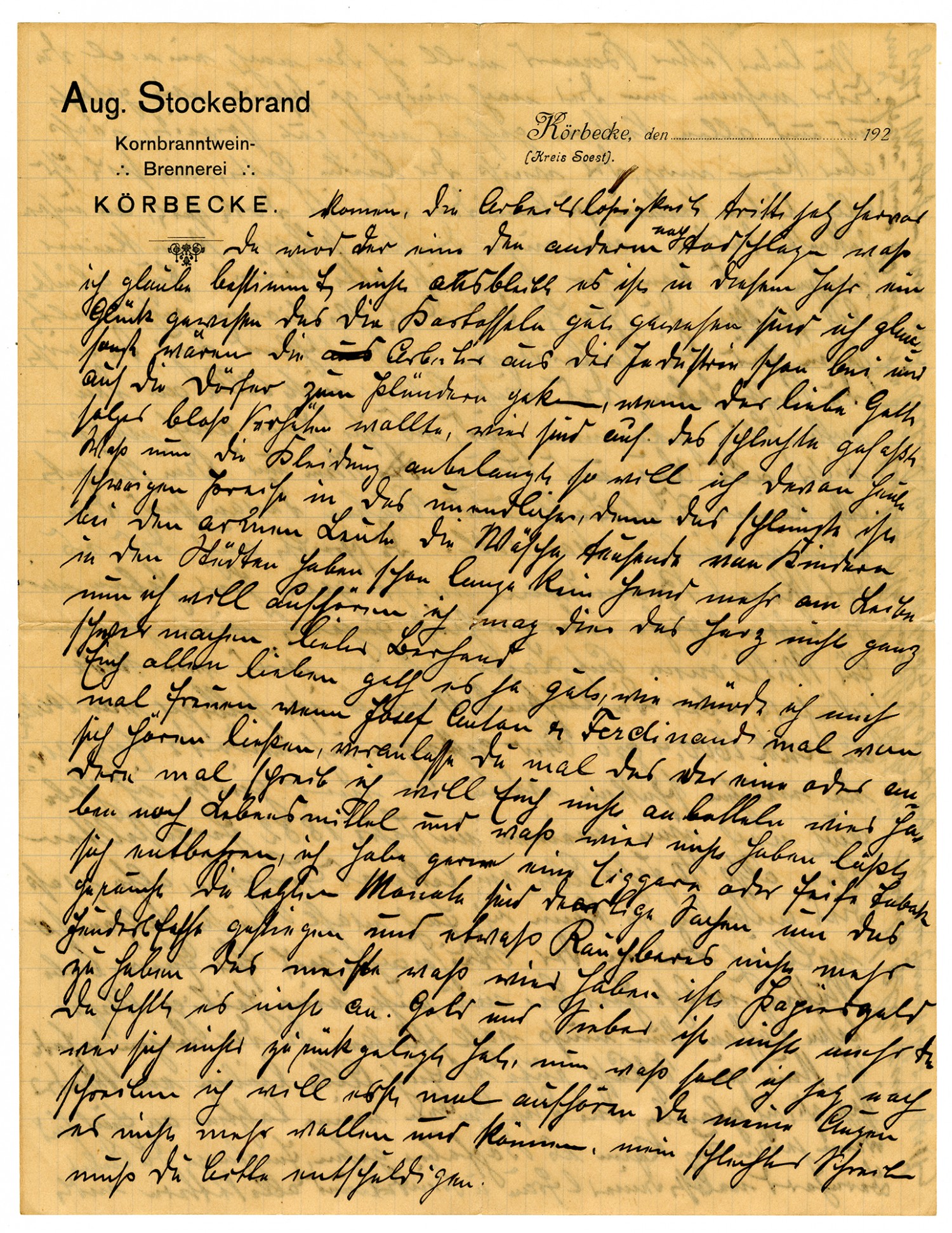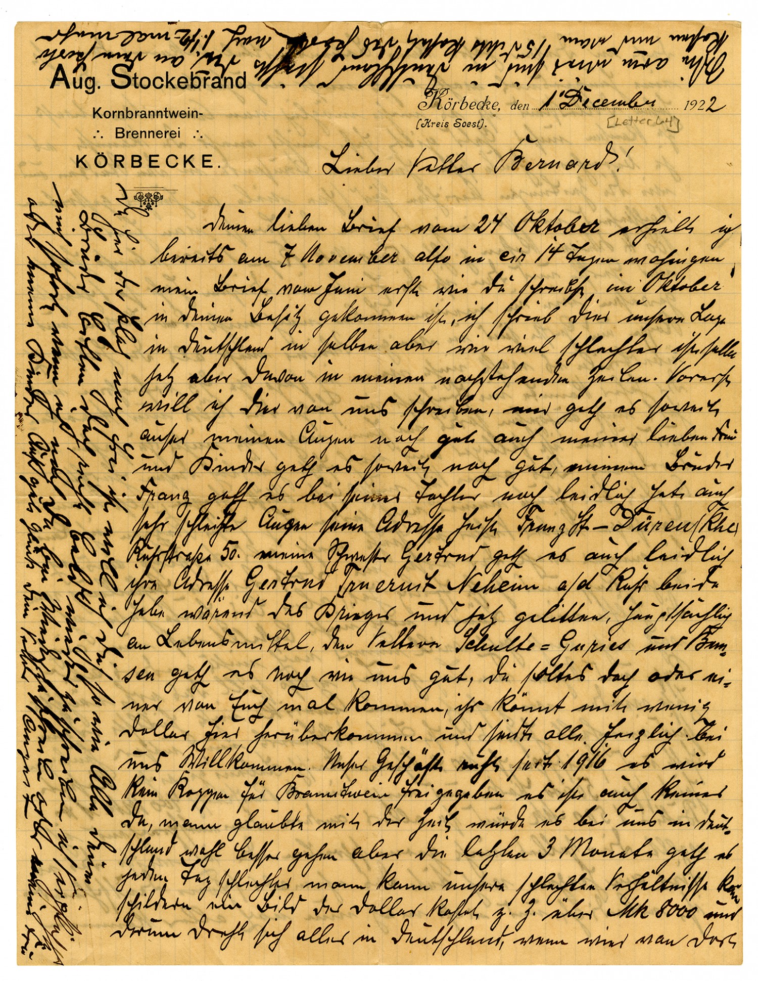 Aug Stockebrand Whiskey Distillery KOERBECKE Koerbecke, 1 December 1922 Dear Cousin Bernard! Your dear letter of October 24 arrived here 14 days later, on November 7. Where did my June letter go? You wrote that you received it in October. In it I wrote to you about our situation in Germany, but the situation is much worse now. But, more about that later. First I want to write to you about us. I am still well so far except my eyes, and my dear wife and children are also doing well. My brother Frank is living with his daughter and is faring tolerably well, he also has poor eyesight. His address is Frank H., Dueren/Khe.., Ruhrstarasse 50. My sister Gertrud is also tolerably well. Her address is Gertrud Truerest, Neheim a/d/Ruhr. Both have suffered during the war and are still suffering, mainly from lack of food. The Cousins Schulte = Garies and Bemsen are doing well, like us. They, or one of you, should come for a visit. You can come over here at my expense and you are all most welcome here. Our business has been idle since 1916. No rye is released for making whiskey, nor is there any to be had. It was believed that in time things would get better for us here in Germany, but things have been going from bad to worse during the last three months. Our bad conditions are almost indescribable. A dollar costs over 8000 marks at this time, and all of Germany hinges on that fact. If we don't get any food from there this year a famine probably cannot be avoided. With the strong dollar it is impossible to buy anything from America. Our money buys practically nothing. It's not hard to figure out. Today, thousands in the cities are going hungry, and the newspapers report that many have already starved to death. Now, in part, the following prices from here. One hundred pounds of wheat cost 15,000 marks at this time. Rye, Oats and Barley are 13,000 marks. Add to that that the crop this year is the worst in my lifetime. One half to two thirds of the wheat, rye and barley - I'm not exaggerating here - froze last winter, and the oats didn't come up in the spring because of cold and drought, so in June there was still nothing to be seen. On top of that, what did grow was rained out in the fall. The poor cattle are practically down to eating manure, and August up until now there is rain almost every day. I can tell you, dear cousin, things appear to be more than discomforting. I am probably always the first man in the village to be finished with the planting of wheat, rye and barley, but up until now half of my land is still not planted and it is getting too late to do so because there is always nothing but rain and snow every day. What will things be like next year? As I said, if America doesn't come to our aid thousands of people will starve. And now, our prices for fat and meat. 100 pounds, live weight, of turkey meat already costs 50,000 makes or more. A pounds of beef costs 400 marks, a pound of beef costs 400 marks, a pound of butter, 1,500 marks, and everything else is proportionately high. I really didn't want to write to you about this since I know it is heartbreaking for you. Germany, once so beautiful, is now laid low, and what else might be yet to come? Unemployment is spreading further now, so that I think it will come to people killing each other. It was fortunate this year that we had a good potato crop. Had that not happened, I believe that industrial workers would already have come to plunder the villages inside and out. If only our dear God will protect these people. We are ready for the worst. I will remain silent today about clothes, the cost of which keeps going up. It is worst among the poor folk. Thousands of children in their huts have long since not had a shirt on their back. Now I will stop. I might break your heart, dear Bernard. Of course, all is well with all of you. How glad I would be if Josef, Anton and Ferdinand would let themselves be heard from for a change. Please urge them to write. I don't want to come to you a-begging; we still have food and we and we can get along without what we don't have. I have liked very much to smoke a cigar or pipe tobacco. In the last couple months, the price of those kinds of things has increased a hundredfold, and even so, smoking tobacco is no longer available. Mostly we have paper money and there is no lack of that. There is no more silver coinage unless one has laid some aside. What else shall I write about now? I will quit because my eyes don't want to any longer, nor can they. Please excuse my poor handwriting. Well dear Cousin Bernard, I will take pen in hand again to write about several matter to you. As I said, all of us cousins are still doing well, but God only knows what is yet to come. How all of you dear cousins are to be envied in that you are there! We don't dare think about our future and nobody can know what might be coming. All of you can consider yourselves lucky. You write that over there millions are being gathered for the needy in Germany, and there, too, you are right in saying that these monies have not all been reaching their intended destination. Here, too, it is nothing but a pack of lies. Practically no thieves and robbers understand anything about what is mine and what is yours, and the newspapers are full of it every day. You write that whiskey is no longer available there. We have had it in superabundance the last couple of years. It is supplied by the state, but in the last two months it has risen in price from 100 marks to 1600 marks per liter. I would gladly send you some if I could. I also still have some of my own corn liquor distilled in 1882 and therefore 40 years old, a delicious little drop indeed. Also, I probably cannot help you in this matter, so I will have a holy Mass read for your dear mother, who is at rest here with us. Now I must probably close since the paper is full. In conclusion, I will bid all of you dear ones farewell. I believe that these lines will be my last ones to you, for things can 