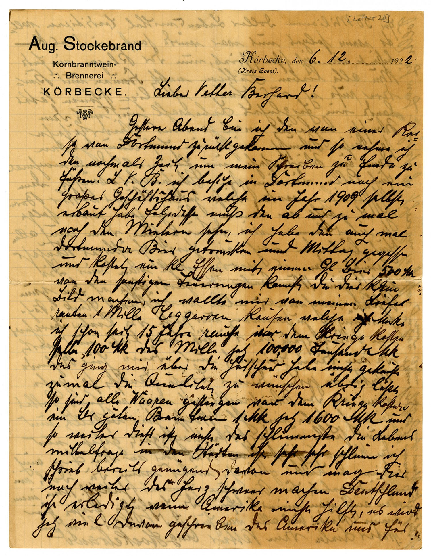 Aug. Stockenbrand Corn Liquor Distillery KOERBECKE December 6, 1922 Dear Cousin Bernard: Yesterday evening I returned from a trip to Dortmund and so will take this night as the time for completing my writing tasks. Dear Cousin Bernard, I still own in Dortmund a large business place, which I myself built in 1909, and consequently have to look after the minter now and then. I had a beer and lunch there. A small meal with a glass of beer cost 500 Mk. You cannot imagine today