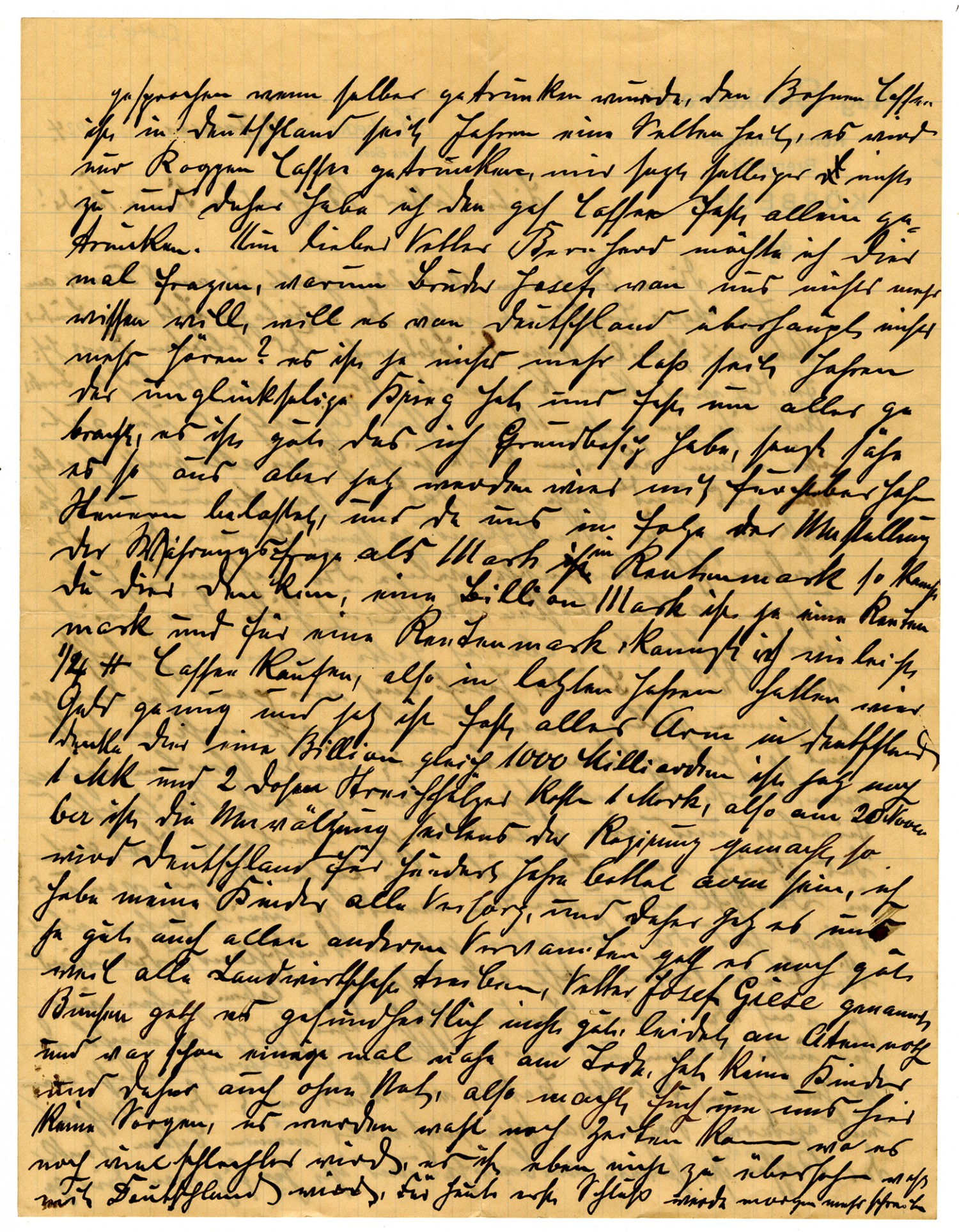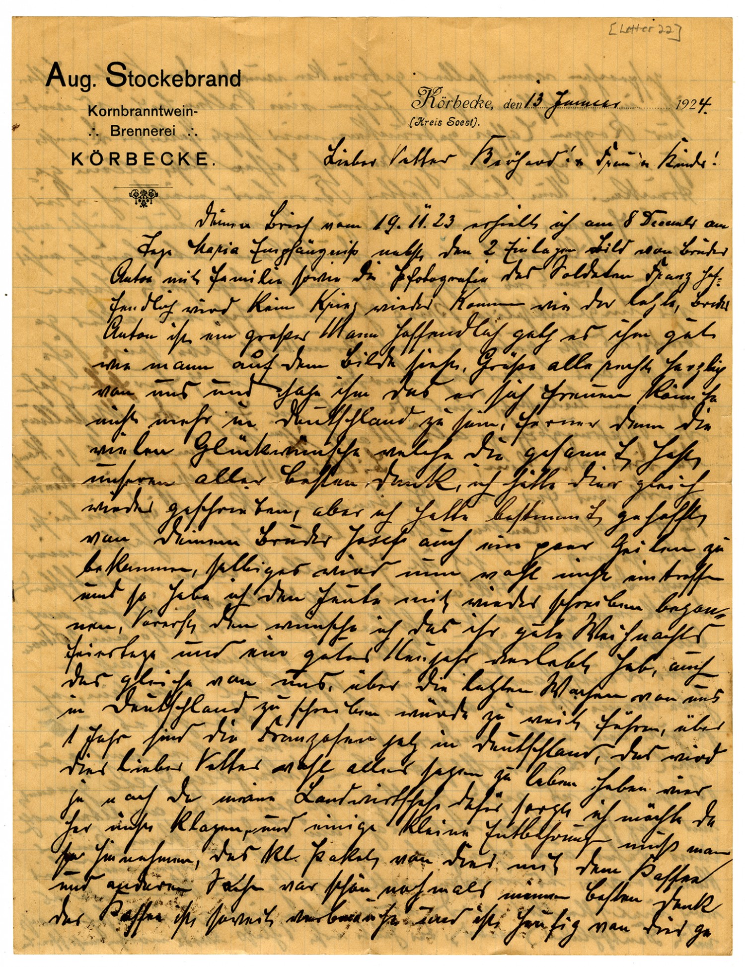 Aug. Stockenbrand Corn Liquor Distillery KOERBECKE January 13, 1924 Dear Cousin Bernard, wife, and children: I received your letter of November 19, 1923, on the 8th of December on the feast of Mary's Immaculate Conception, along with the two enclosed pictures of brother Anton and family, and the photograph of Franz, the soldier. Hopefully we won't have another war like the last one. Brother Anton is a big man. Hopefully he is as well as the picture shows him to be. Give them all our sincere greetings and tell him he can be glad he is no longer in Germany. And thanks from us all for the good wishes you passed along. I would have answered you right away, but I had certainly hoped to get a few lines from your brother Joseph as well. That probably won't happen now, and so I have begun today to answer you. First of all, I hope that you had good celebrations for Christmas and New Year. The same good wishes to you from us. It would take too much to write about us in Germany these last weeks. The French have now been in Germany for a year. That, dear cousin, will tell you the whole story. We have the necessities of life, to be sure, since my farm takes care of that. And so I won't complain. Some small deprivations have to be borne. The small package from you, with the coffee and other things, was wonderful. Once again, my sincere thanks. The coffee has been used up and is frequently received from you. Unemployment now makes its appearance. I firmly believe its going to come to one person killing another. It was fortunate this year that the potatoes were good. Otherwise, I believe that the workers from the factories would already have come to us out of the cities in order to plunder. Even if the dear God looks after us, we are prepared for the worst. As far as clothing is concerned I won't say anything about that today. The poor folks are faring the worst. Thousands of children in the cities haven't had a shirt on their body for a long time. I'm going to stop now, dear Bernard; I don't want to give you a heavy heart. All of your loved ones are faring well indeed. How happy I would be if Joseph, Anton, and Ferdinand would let themselves be heard from. See if you can't get one or the other to write. I won't come a-begging to you. We still have food and we can do without the things we don't have. I liked to smoke a cigar or a pipeful of tobacco. During the past month the price of things of that kind has soared a hundredfold, and no longer available. What we have the most of is paper money. There's no lack of that. There is no more gold and silver unless someone has laid some away. Now what more shall I write? I will quit for now because my eyes can't and won't go on. Please, you must forgive my bad handwriting. Dear Cousin Bernard, I will take pen in hand once again to write a few more things. As I said, we and all the cousins are well so far. God knows what is still to come. How all of you dear cousins are to be envied that you are there. We dare nothing of our future. Nobody can know it, or what might happen. You can all consider yourselves fortunate. You write that millions have been collected there for the needy in Germany. You have it right -- these moneys don't all reach the place for which they are intended. Here, it is nothing but lies and deception. Theft recognizes no "mine and thine," and the newspapers are daily full of robberies. You write that no liquor is available there any more. Here we have had a surplus for the last two years. We have millions worth of it in storage. It is made from barley. But in the last two months the price has gone from 100 Mark to 1600 Marks per liter. I would gladly send you some if that could be done. I also have some corn liquor that I put away in 1882 and so is 40 years old. A fast troepchen. And so as far as this in concerned I can't be of any help to you. And so I will have a Mass said during this Christmastime for your dear mother who reposes her with us. Now I must close because I am coming to the end of the sheet. In closing I send you all an "auf wiedersehen". I keep thinking that these lines will be my last ones to you, because every day it can go kopfaelen. Dear Bernard and your wife and children and all dousing with their wives and children, accept sincere Christmas greetings and also a happy new year from us all. Especially, accept sincere greetings from You cousin August