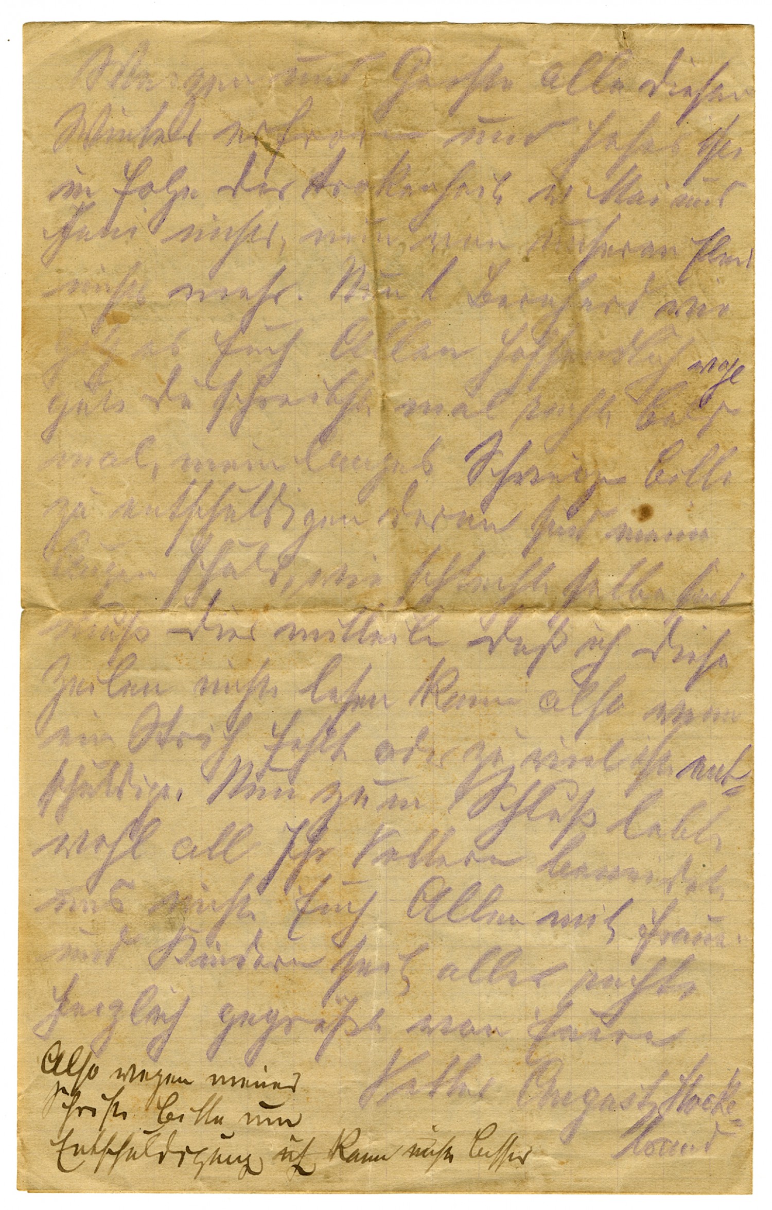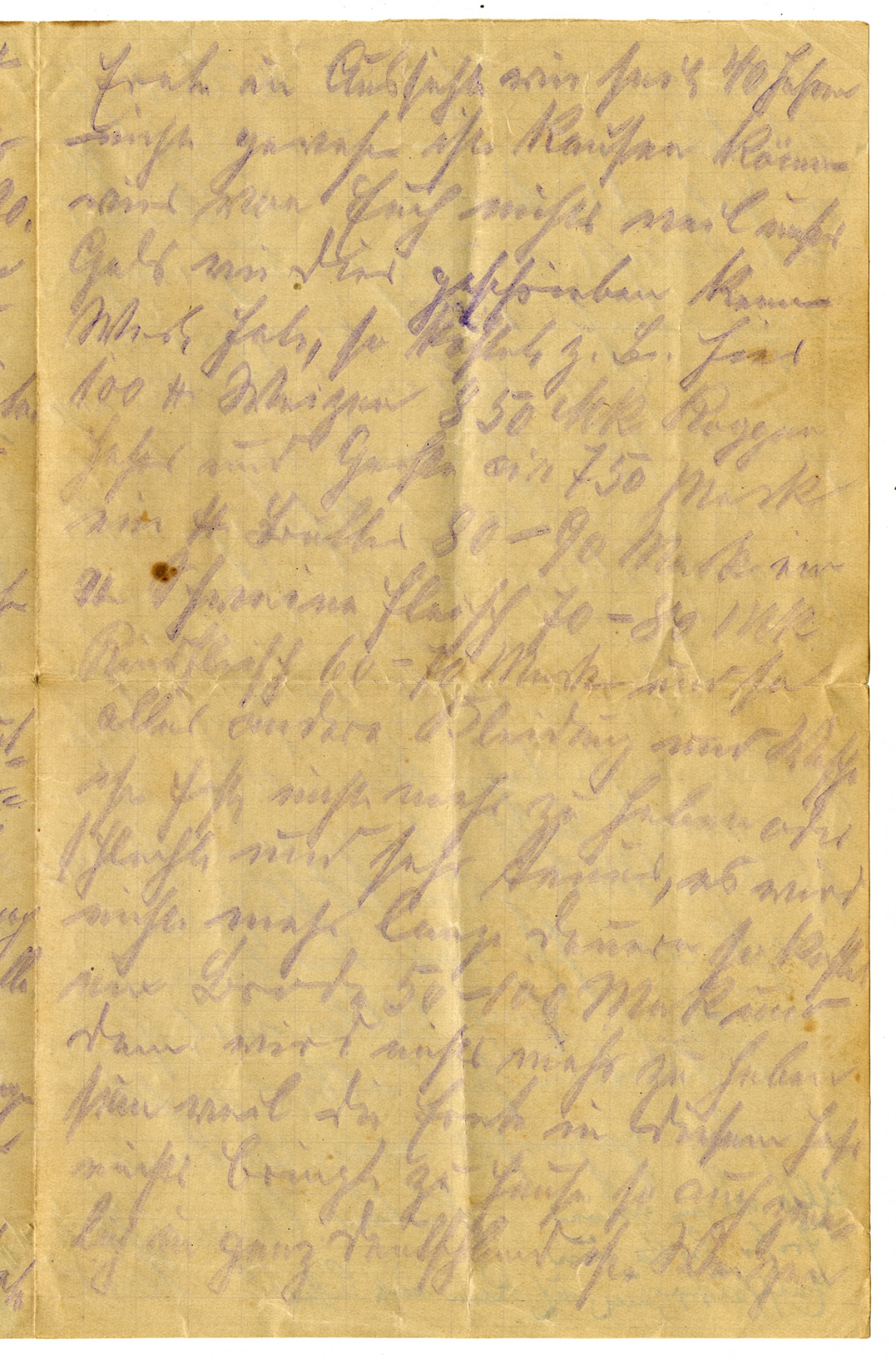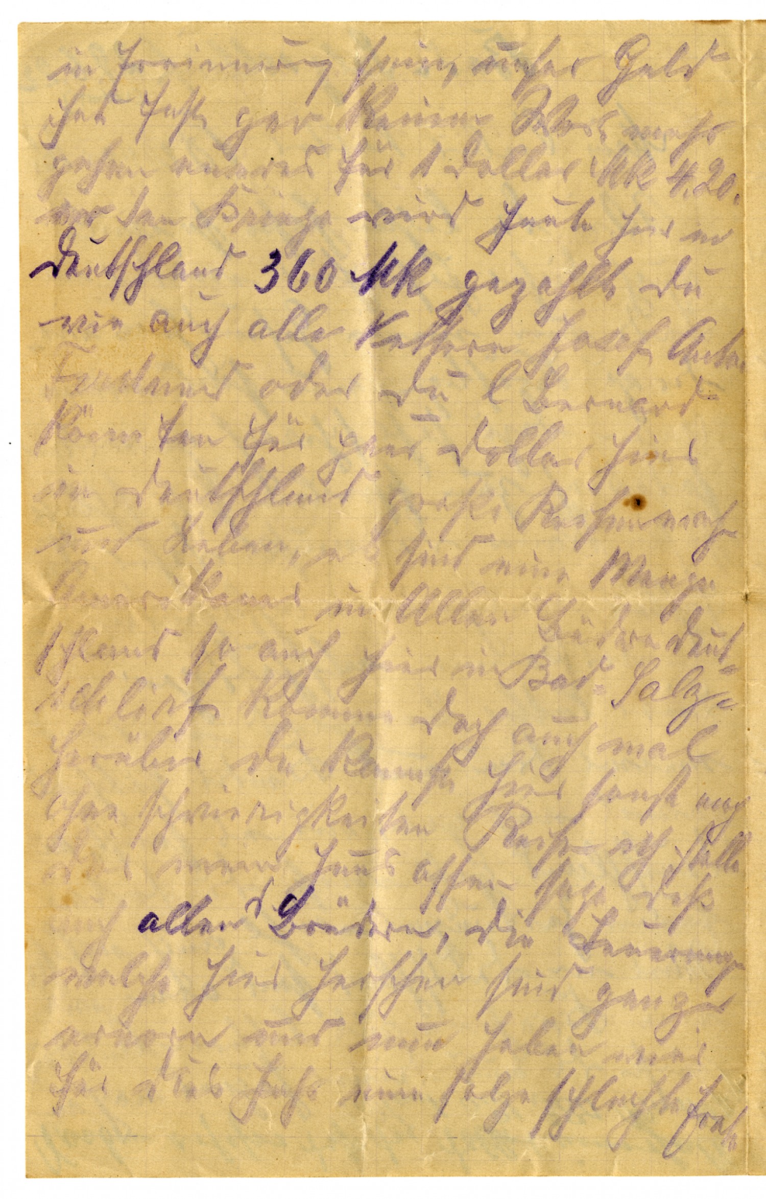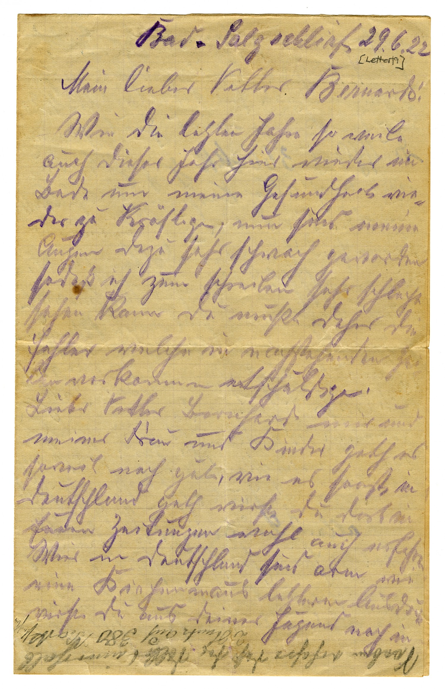Bad Salsliech June 29, 1922 My dear Cousin Bernard! This year, so far, is like last year. I am again her at the baths in order to improve my health. Now my eyes have become so weak that I can't see very well to write. And so you must pardon the shortcomings which you find in the next lines. Dear cousin Bernard, I and my wife and children are still well so far. Outside of that, you can read in your local papers how things are in Germany. We in Germany are as poor as a church-mouse. ......you know from your youth are still in ... Our money is no longer worth anything. One of your dollars, worth 4.29 Mk before the war, now brings 360 Mk. You as well as all the cousins, Josef, Anton, Ferdinand or you yourself dear Bernard, could live well here in Germany for a few dollars. There are a number of Americans in all of South Germany and also here in Bad Salzschlief. Why don't you come on over? Here you could lay your cares to rest. My house is open to you. Tell all of your brothers. The inflation that prevails here is enormous and now we have for this year .... such as hasn't been seen in 40 years. We cannot buy anything from you because our money, as I wrote you, has no value. For example, 100 pounds of wheat costs 850 Mk, and rye, oats, and barley around 750 Mk. A pound of butter is 80-90- Mk. A pound of pork, 70-80 Mk, of beef, 60-70 Mk. And so with everything else. Clothing and cotton is almost unavailable, because the harvested goods bring nothing as of today. It's that way all over Germany. .... and gardens all froze this winter, and yield nothing in the wake of a drought in May and June. But we no longer suffer the earlier misery. Now, dear Bernard, how are all of you. Hopefully very well. Write very soon. Forgive my lousy handwriting. My eyes are to blame because they are so superfluous, please excuse. Now in closing, fare well, all of you honorable cousins. Heartfelt greetings to you all and to your wives and children from your cousin, August Stockebrand. Please forgive my lousy writing. It's the best I can do. Just now the dollar rose to 380 Mark.