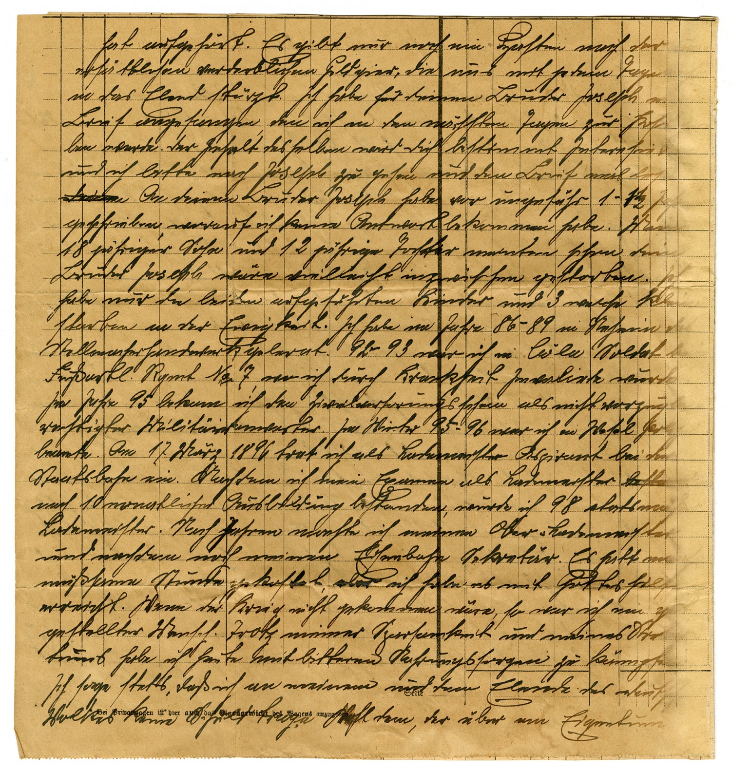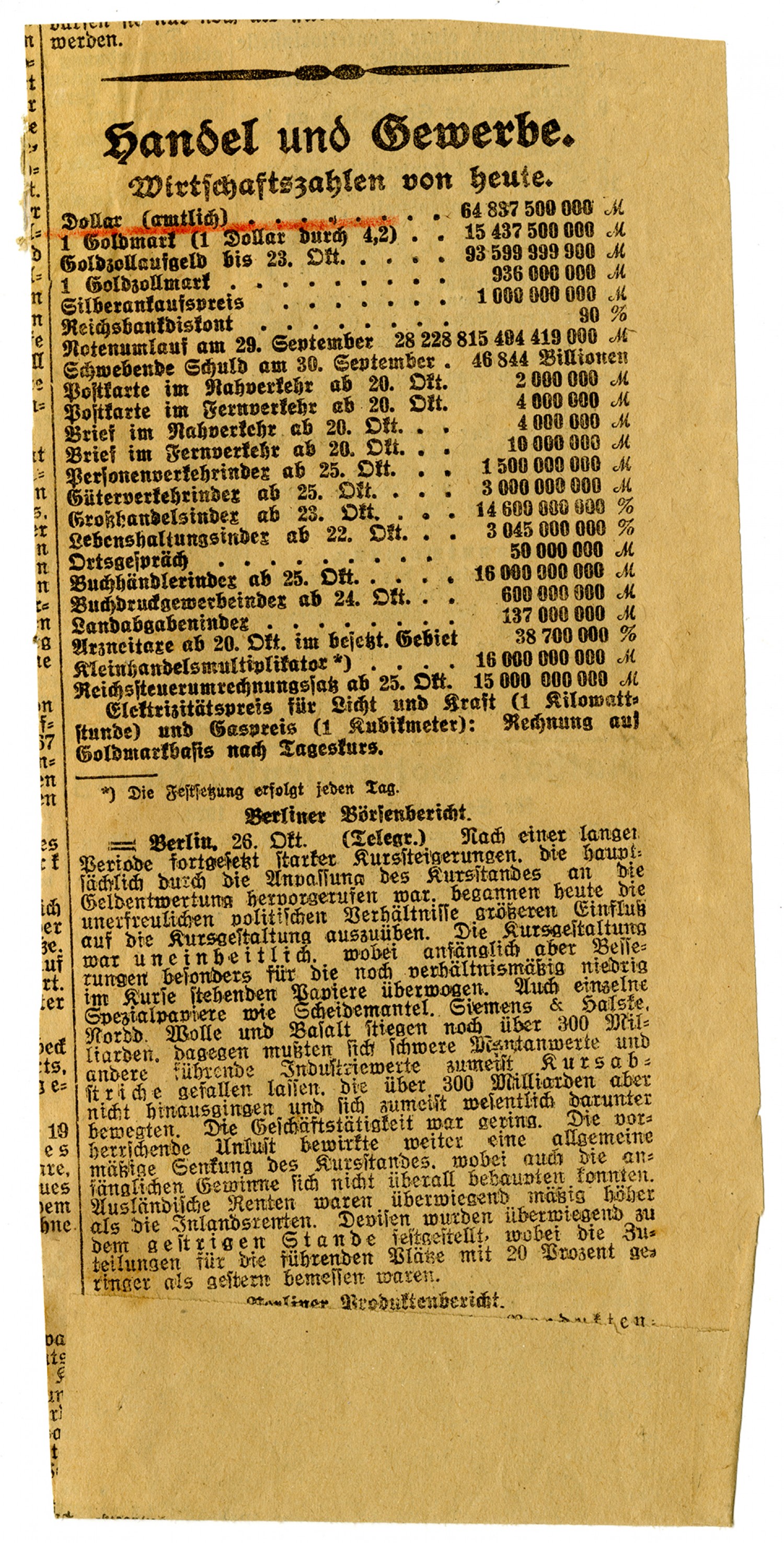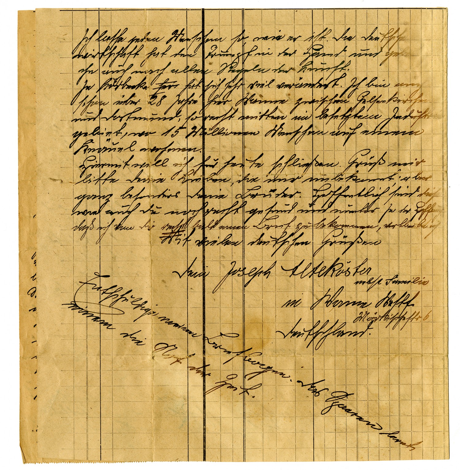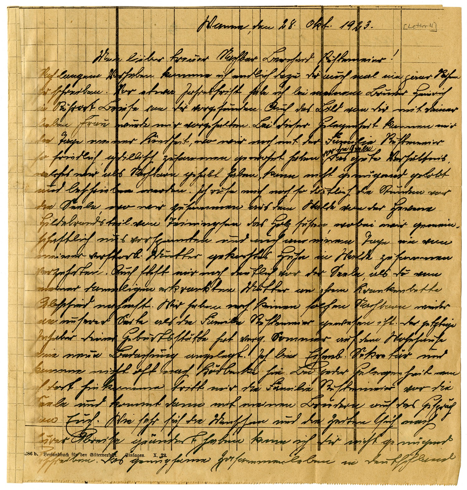 Hamm October 28, 1923 Mr. Bernhard Rustemeier in Loose Creek B. M. Osage Co. Mo. Nord Amerika My Dear Loyal Neighbor, Bernard Rustemeier! After much procrastination I am finally getting around to writing to you about a few things. Several years ago, I came across your letter to my brother Heinrich in the rest home and also saw a picture of you and your dear wife. This brought to mind the days of my childhood, when we lived so gedillisch happily together with the Rustemeyer family. The good relationship that we had as neighbors cannot be praised enough I still recall so clearly the hours when we teamed up and together hauled wood out of the forest of Mr. Hildebrandes. And remember one day how we took my deceased mother's cooked chicken and ate it in the woods. I remember clearly when you bade my mother farewell at her sickbed. We never have had neighbors such as the Rustemeier family been. The current neighbor to your birthplace put on a new roof last summer. I am a secretary with the railroad and don't get to Koerbecke very often, but every time I go there I am reminded of the Rustemeier family, and my brother and I speak of you. I cannot adequately describe how drastically the people and the times have chafed since you left. Contented community life in Germany is a thing of the past. The only money we have is rapidly devalued, which plunges us into misery every day. I started a letter to your brother Joseph which I will mail in a few days. Its contents will certainly be of interest to you, and I ask you to visit Joseph and read the letter. I wrote to him about a year and a half ago but have received no answer. My eighteen year old son, and my twelve year old daughter were thinking that perhaps your brother died in the meantime. I have only the two grown children besides three who died in infancy. In 86-89 I learned the wheelwright trade in Neheim. From 92 t0 93 I was a soldier with infantry regiment No. 7, where I became ill and was discharged. In 95 I received the ....already as not ... .... During the winter of 95-96 I was a bailiff in Wesel. On March 17, 1896 I stepped in as an apprentice Lademeister with the streetcar line. After I took an exam on Lademeister following ten monthly training sessions I became statsma...Lademeister in 98. The next year I became Lademeister supervisor and, after that, the secretary of the streetcar line. It cost me dearly but with God's help I reached my goal. Had the war not come along, I would be sitting pretty today. In spite of my thriftiness and Stre...tuns I am having a bitter struggle with worry about the food supply. I always say, in answer to the question asked by myself and suffering people, that the one who has control of a landed estate need not worry about food. The following will illustrate how little German agriculture in unoccupied territory gives to the inhabitants of the occupied industrial section. Some four or five weeks ago, I wrote to my brother Anton's oldest son, about 26-28 years of age, and asked him to be so kind as to obtain for me 10 bte of potatoes. In the event that they themselves did not have that many to spare, he should approach my brother Franz, who came through the whole town anyway and who in any case would be helpful to him and deliver this quantity. I had searched the markets throughout my associate who lives in Koerbecke and works her in Hamm, and heard by word of mouth that the potatoes appear bad. I could not get any. I leave it to you to discern what kind of an answer this is or how this is of benefit to us. But I have to note that my brother Anton has bought so much land that he has had, for about 10-15 years, three heavy horses, and behind the house towards Rumps, opposite the garden, a huge herd of cattle. But I ask you not to write anything about this to Koerbecke. Lord, forgive them; for they know not what they do. A well known adage has it that "the more the devil has, the more he wants." But, for God's sake, don't read that to mean that my brother Anton and his family are some kind of devil. I let people be as they are. The German economy has the trumps in the hand, and will deal with him too with every trick in the book. Koerbecke has changed dramatically. I have already been here in Hamm, between Gelsenkirchen and Dortmund, for over 28 years, and therefore right in the middle of the occupied Jewish district, where 15 million people live in one group. With that, I will close. Please greet your loved one, whom I don't know, but especially your brother. Hopefully you and they are still hale and hearty. Hoping that, just like you, I perhaps will soon receive a letter, I remain with many German greetings, the Joseph Altekoester Family in Hamm, Westphalia, Maerkische Str. 6 Germany Pardon my writing paper. Hard times teach thrift. Commerce and Industry Today's Economic Figures Dollar (official) - 64,837,500 M[ark] 1 Goldmark (1 Dollar through 4,2). - 15,437,500,000 M Goldzollaufgeld until 23 October. - 93,599,999,900 M 1 Goldzollmark - 936,000,000 M Silver - 1,000,000,000 M National bank discound - 90% Notes in circulation - 28,228,815,494,419,000 Debt as of 30 September - 46,844 Billion Postcards, domestic, as of October 20 - 2,000,000 M Postcards, foreign, as of October 20. - 4,000,000 M Letters, domestic, as of October 20.. 4,000,000 M Letters, foreign as of Oct 20 - 10,000,000 M Performenverkehrindex as of October 25 - 1,500,000,000 M Dealing in Goods index as of Oct 25 - 3,000,000,000 Wholesale index as of Oct 23 - 14,600,000,000 Cost of Living index as of Oct 22 - 3,045,000,000 Local phone call - 50,000,000 Bookseller index as of Oct. 25 - 16,000,000,000 Book publisher inder (?) as of Oct 24 - 600,000,000 Land Tax index 137,000,000 Medicin Tax index as of Oct 20 in the besieged district - 38,700,000 % Kleinhandelsmultiplikator (revised daily). - 16,000,000,000 National currency conversion tax as of Oct 25. - 15,000,000,000 Electricity for lights and power (1 kilowatt) and Gas (1 stere): reckoned at da