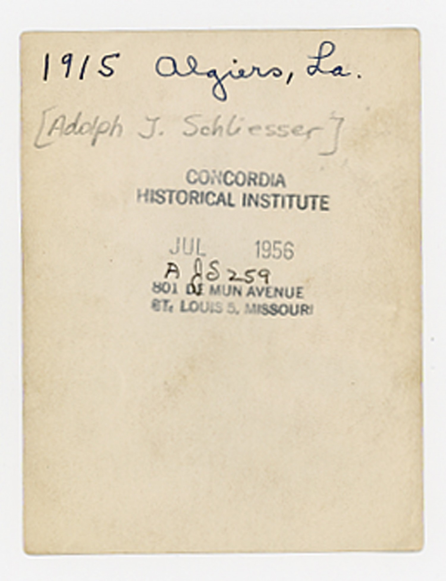 | Source | Unknown. Adolph J. Schliesser Photograph. ca. 1915. Schliesser, Adolf J. Collection. Concordia Historical Institute, St. Louis, Missouri. |
