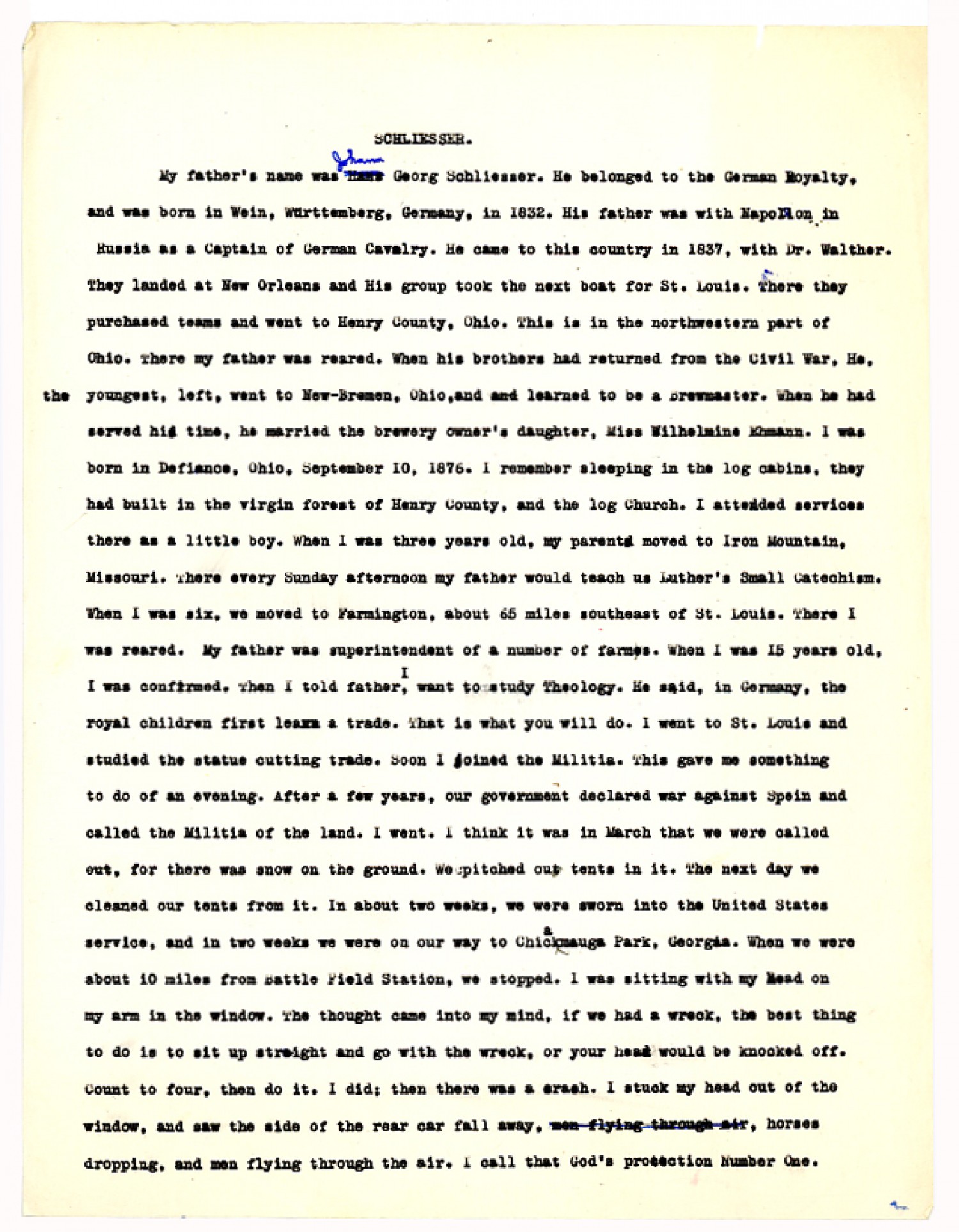 | Source | Schliesser, Adolf J. Recollections of Adolph J. Schliesser. ca. 1957 Schliesser, Adolf J. Collection. Concordia Historical Institute, St. Louis, Missouri. |