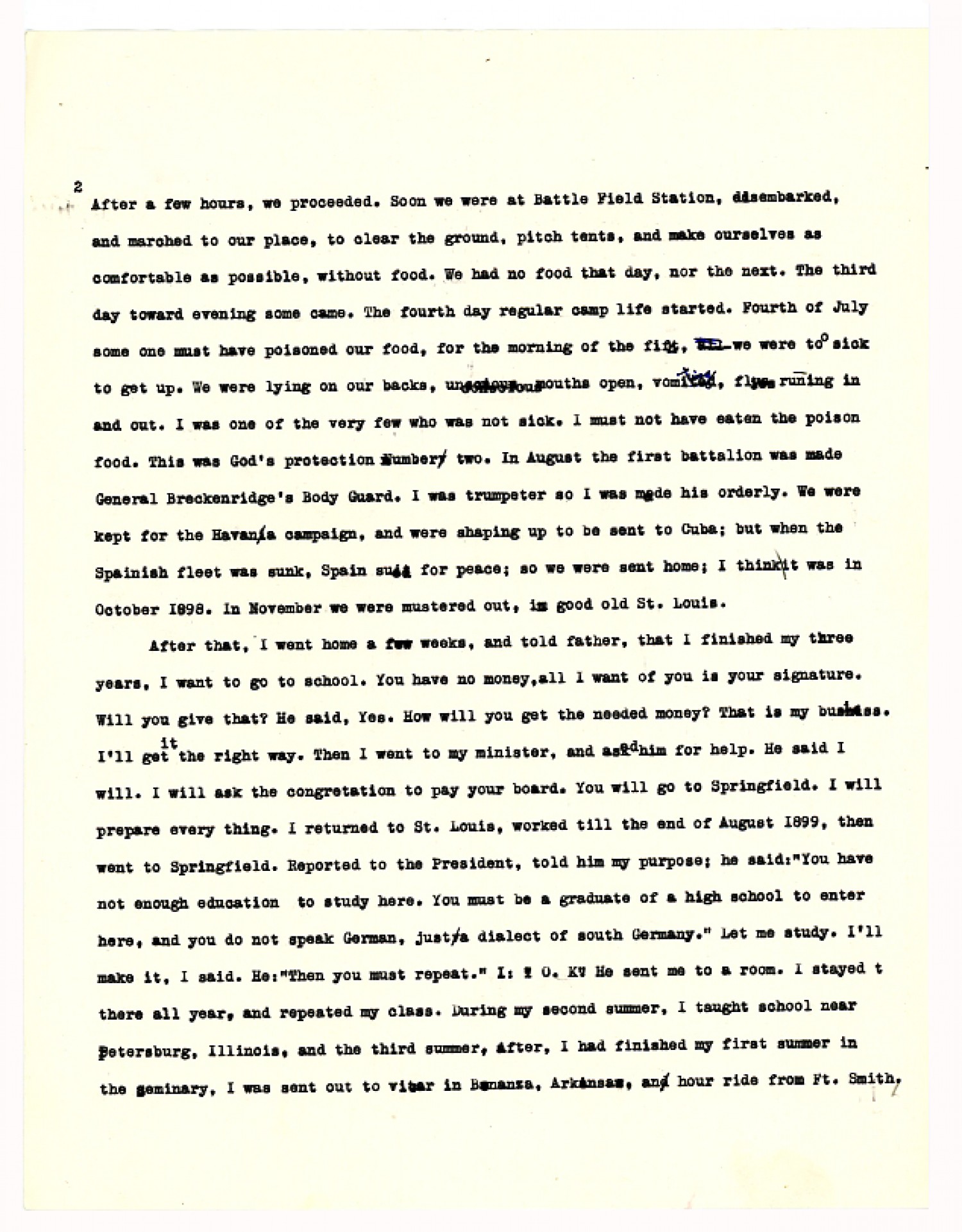 [page 2] After a few hours, we proceeded. Soon we were at Battle Field Station, disembarked, and marched to our place, to clear the ground, pitch tents, and make ourselves as comfortable as possible, without food. We had no food that day, nor the next. The third day toward evening some came. The fourth day regular camp life started. Fourth of July some one must have poisoned our food, for the morning of the fifth, we were too sick to get up. We were lying on our backs, mouths open, vomiting, flies running in and out. I was one of the very few who was not sick. I must not have eaten the poison food. This was God