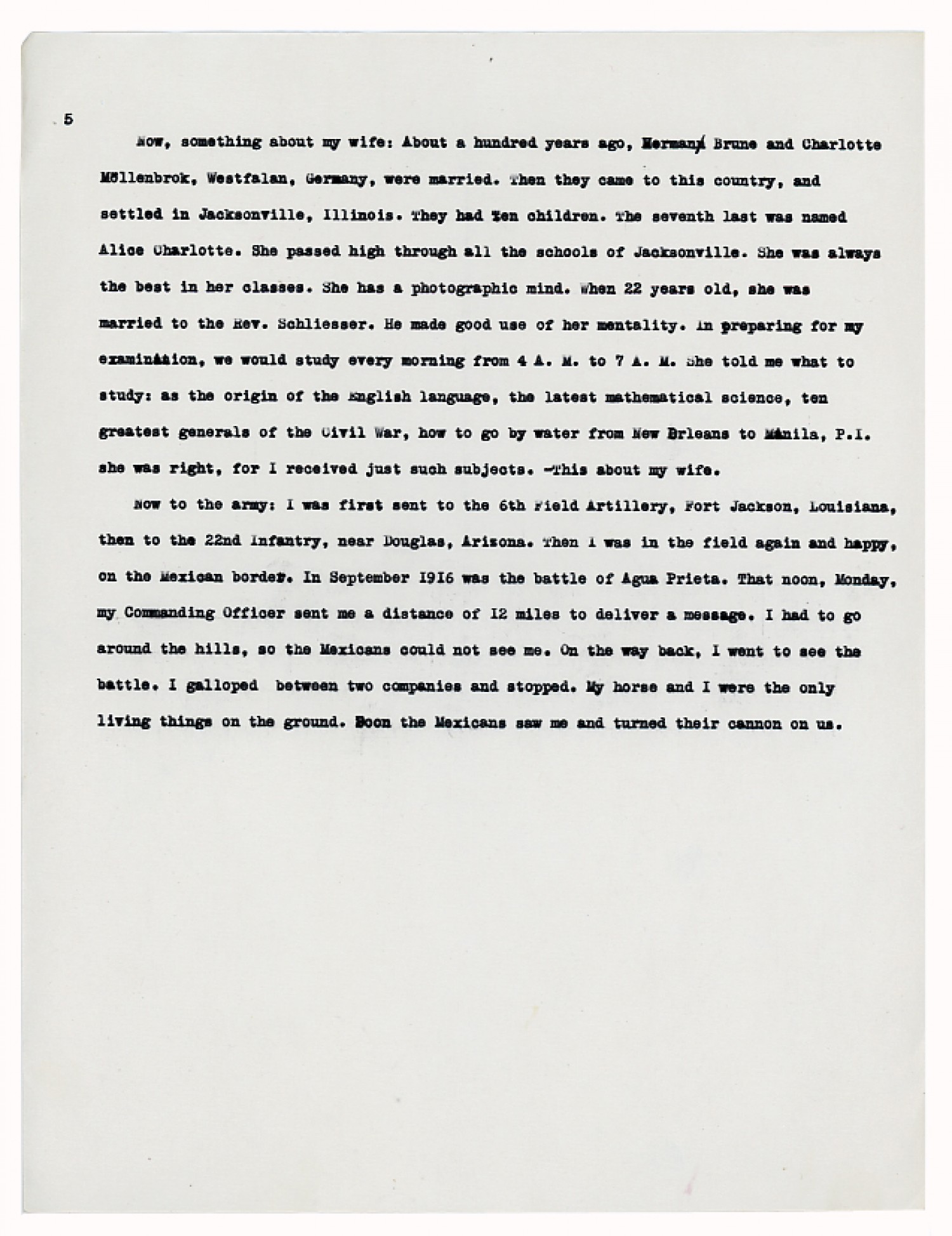 [page 5] Now, something about my wife: About a hundred years ago, Herman Brune and Charlotte Mullenbrok, Westfalan, Germany, were married. Then they came to this country, and settled in Jacksonville, Illinois. They had Ten children. The seventh last was named Alice Charlotte. She passed high through all the schools of Jacksonville. She was always the best in her classes. She has a photographic mind. When 22 years old, she was married to the Rev. Schliesser. He made good use of her mentality. In preparing for my examination, we would study every morning from 4 A. M. to 7 A. M. She told me what to study: as the origin of the English language, the latest mathematical science, ten greatest generals of the Civil War, how to go by water from New Orleans to Manila, P.I. she was right, for I received just such subjects.